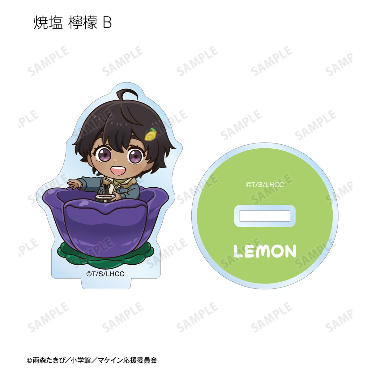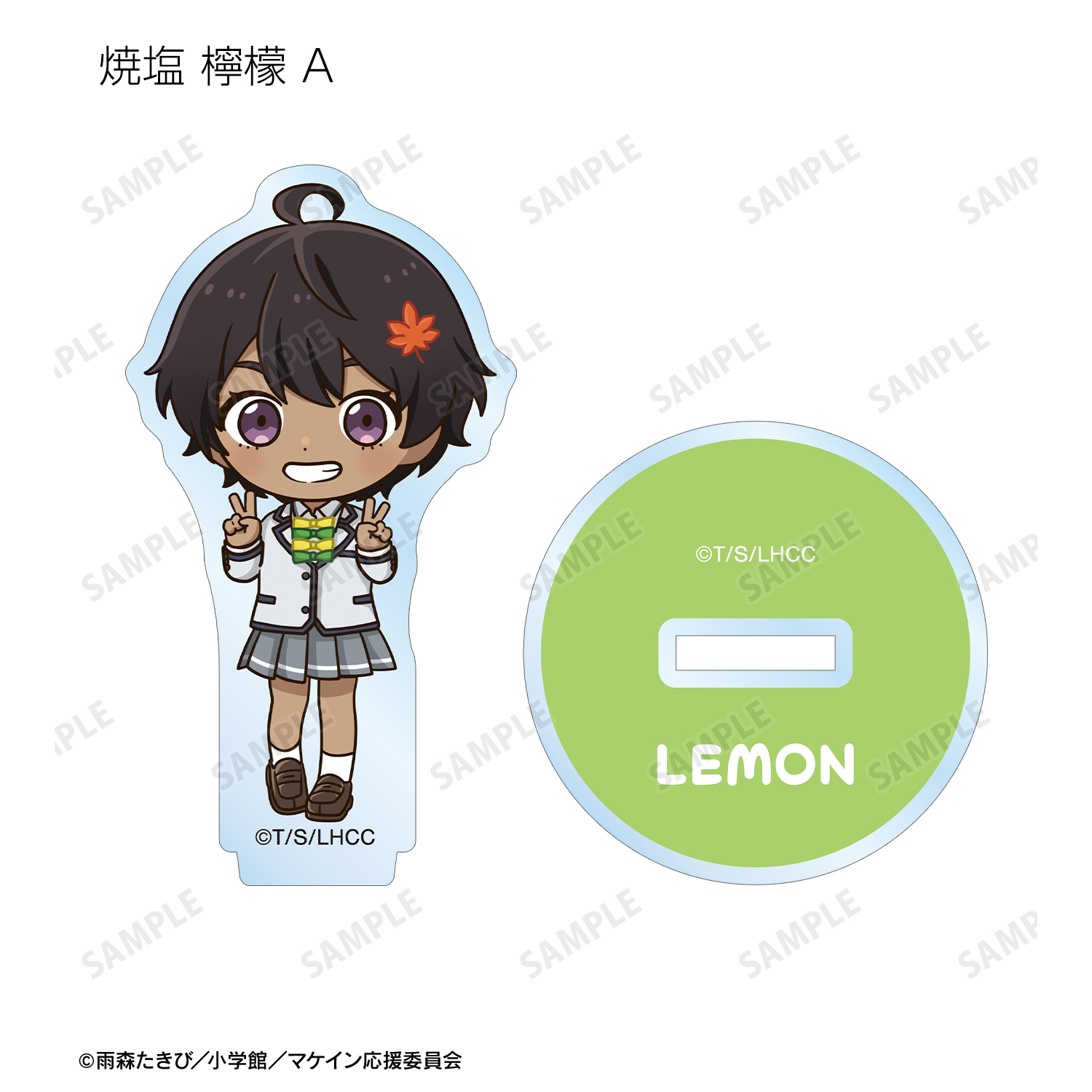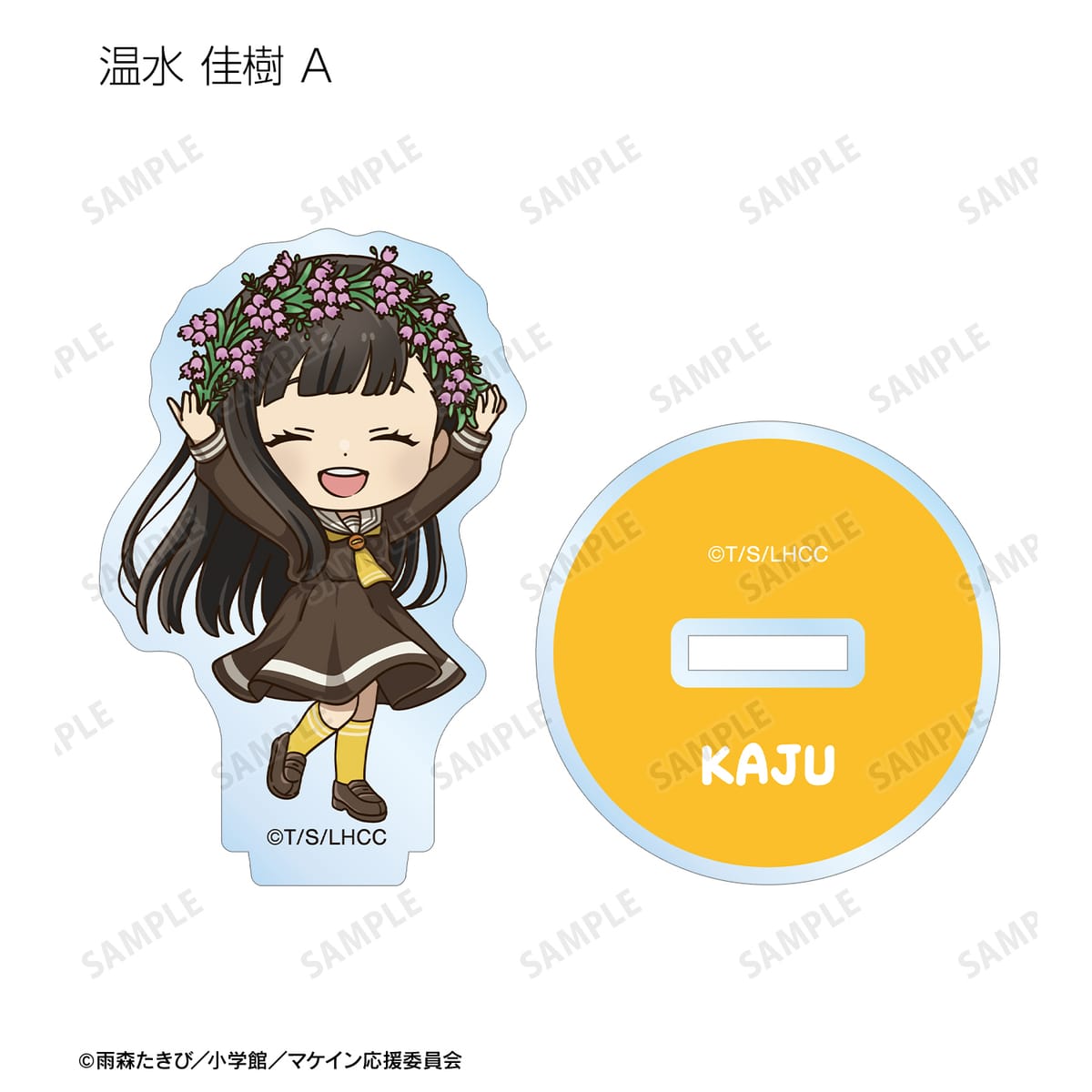 温水 和彦、八奈見 杏菜、焼塩 檸檬、小鞠 知花、温水 佳樹、月之木 古都、姫宮 華恋、朝雲 千早、志喜屋 夢子、放虎原 ひばり、馬剃 天愛星の描き起こしちびキャライラストをメインにデザインし、アクリルスタンドに仕上げました。