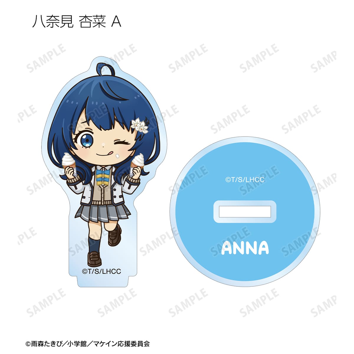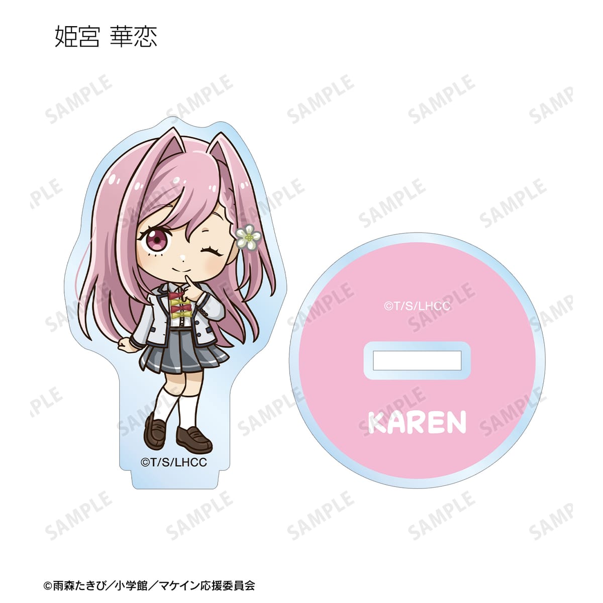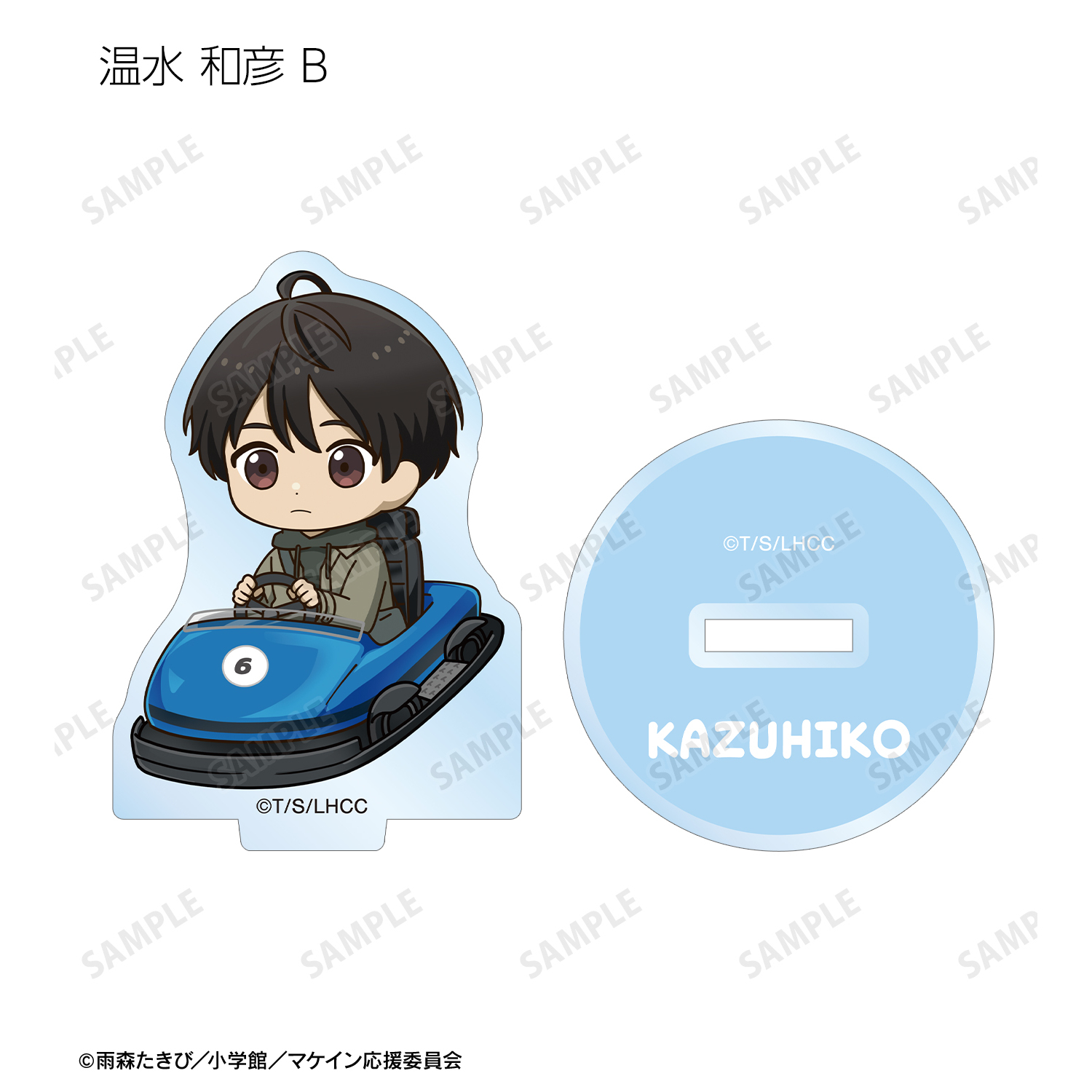 温水 和彦、八奈見 杏菜、焼塩 檸檬、小鞠 知花、温水 佳樹、月之木 古都、姫宮 華恋、朝雲 千早、志喜屋 夢子、放虎原 ひばり、馬剃 天愛星の描き起こしちびキャライラストをメインにデザインし、アクリルスタンドに仕上げました。