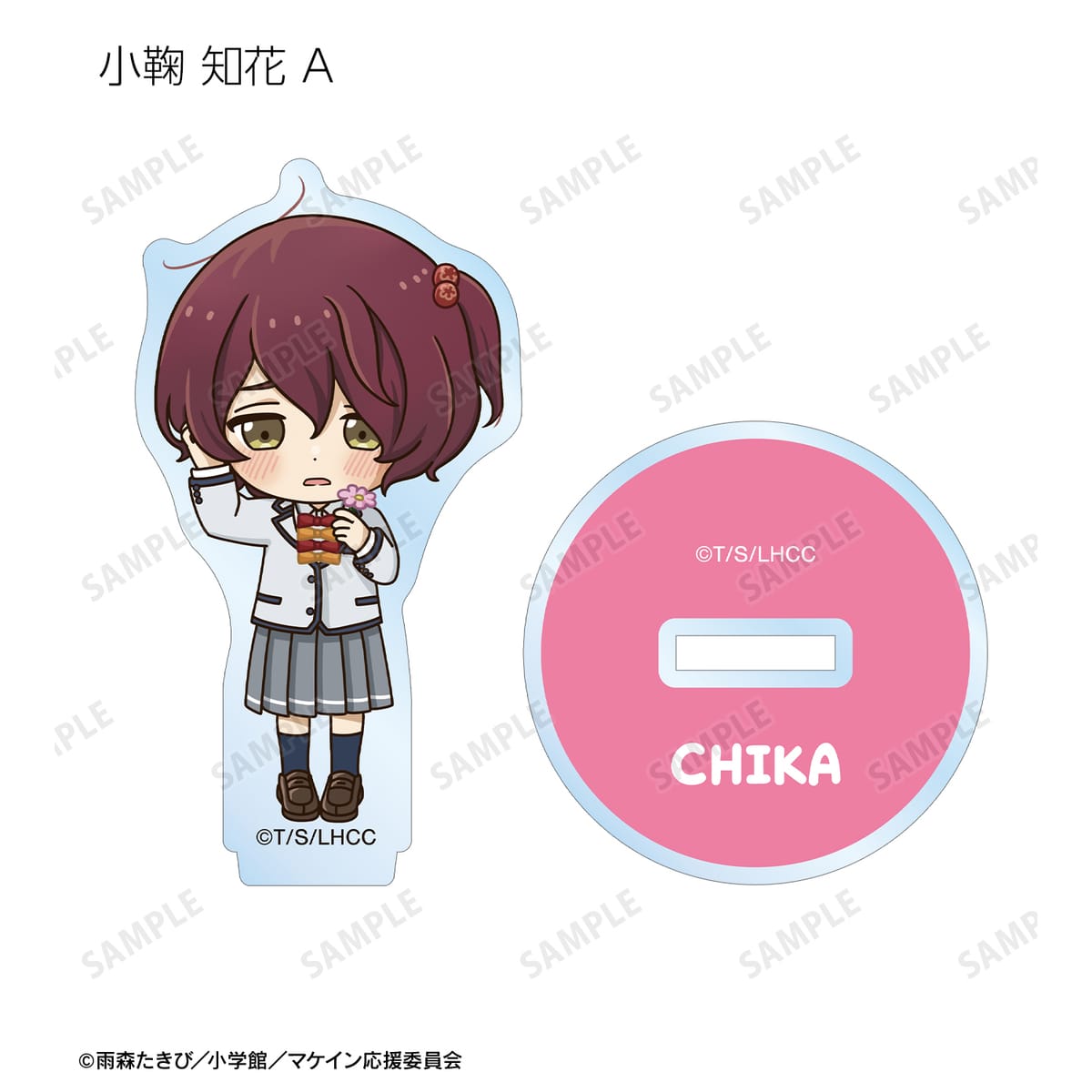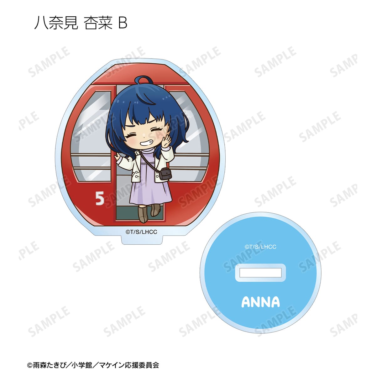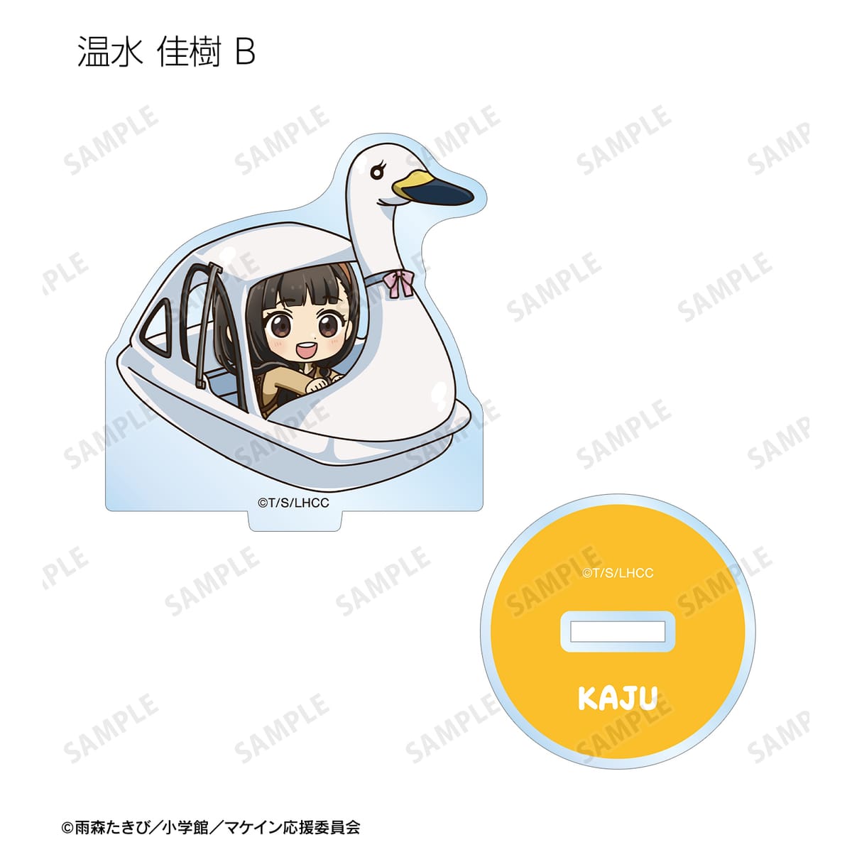 温水 和彦、八奈見 杏菜、焼塩 檸檬、小鞠 知花、温水 佳樹、月之木 古都、姫宮 華恋、朝雲 千早、志喜屋 夢子、放虎原 ひばり、馬剃 天愛星の描き起こしちびキャライラストをメインにデザインし、アクリルスタンドに仕上げました。