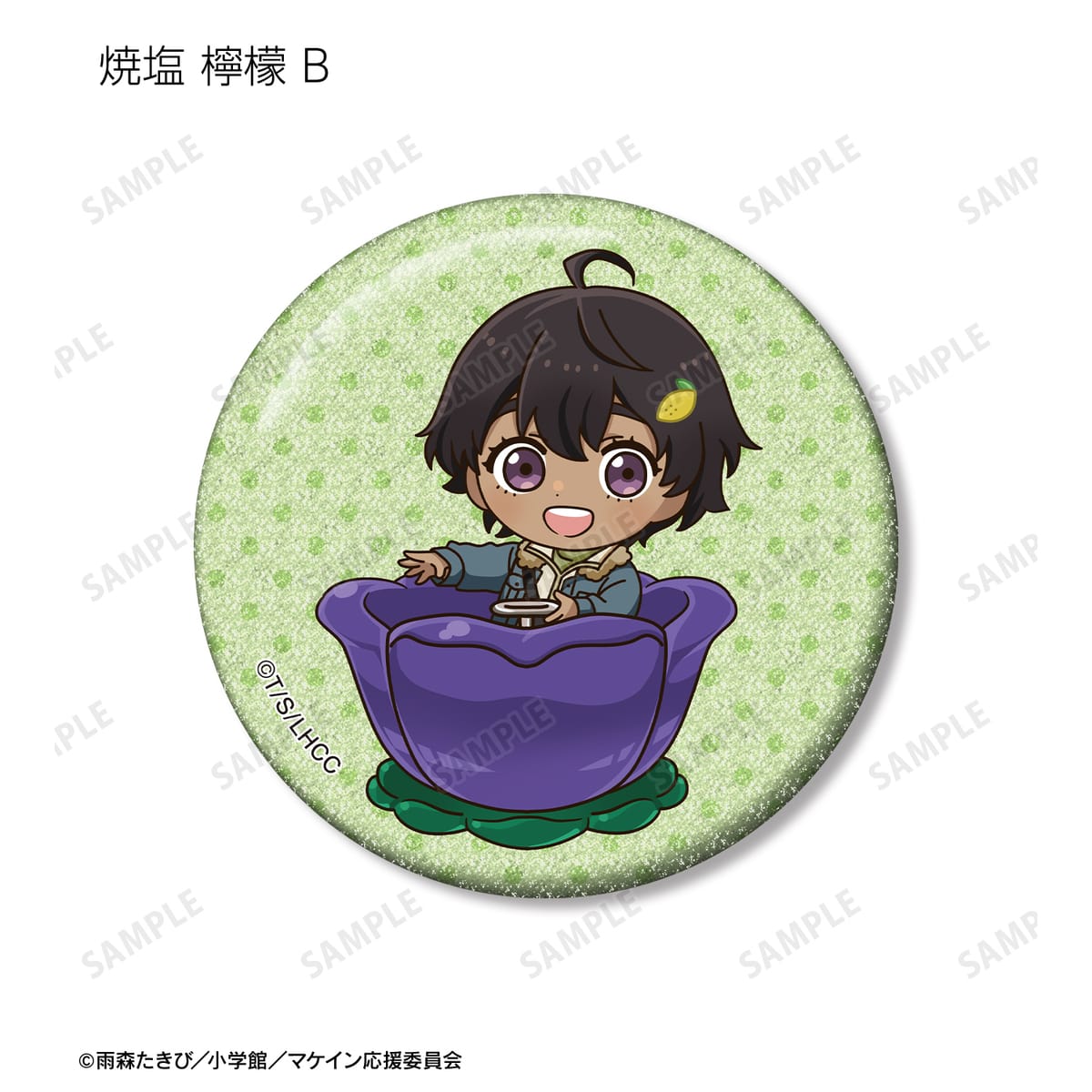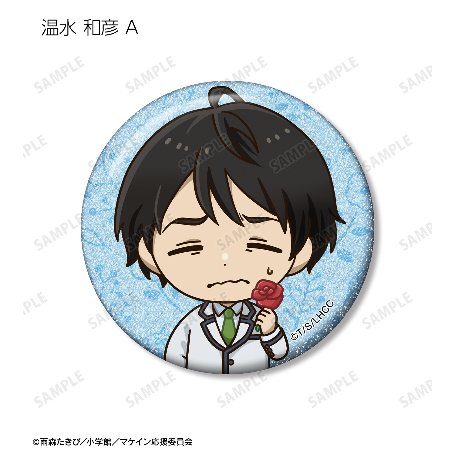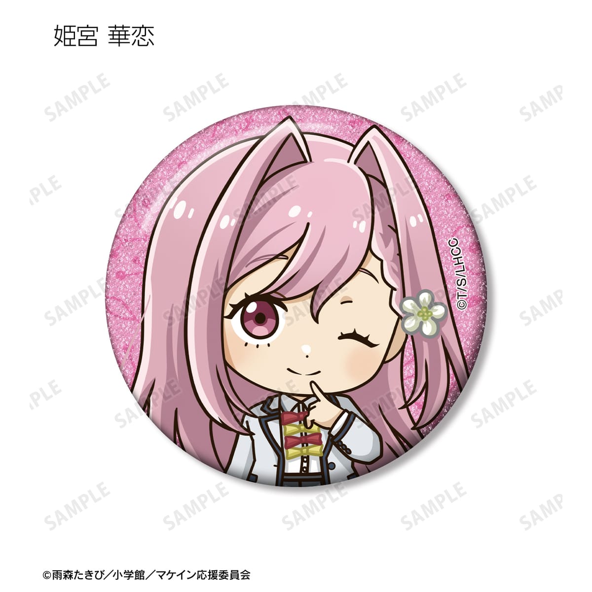 温水 和彦、八奈見 杏菜、焼塩 檸檬、小鞠 知花、温水 佳樹、月之木 古都、姫宮 華恋、朝雲 千早、志喜屋 夢子、放虎原 ひばり、馬剃 天愛星の描き起こしちびキャライラストをメインにデザインし、グリッター加工を施した缶バッジに仕上げました。