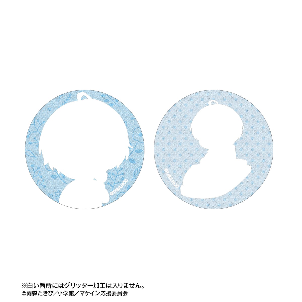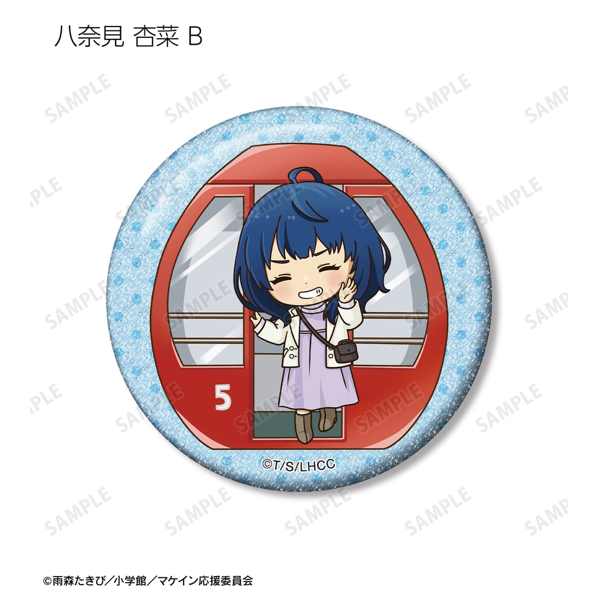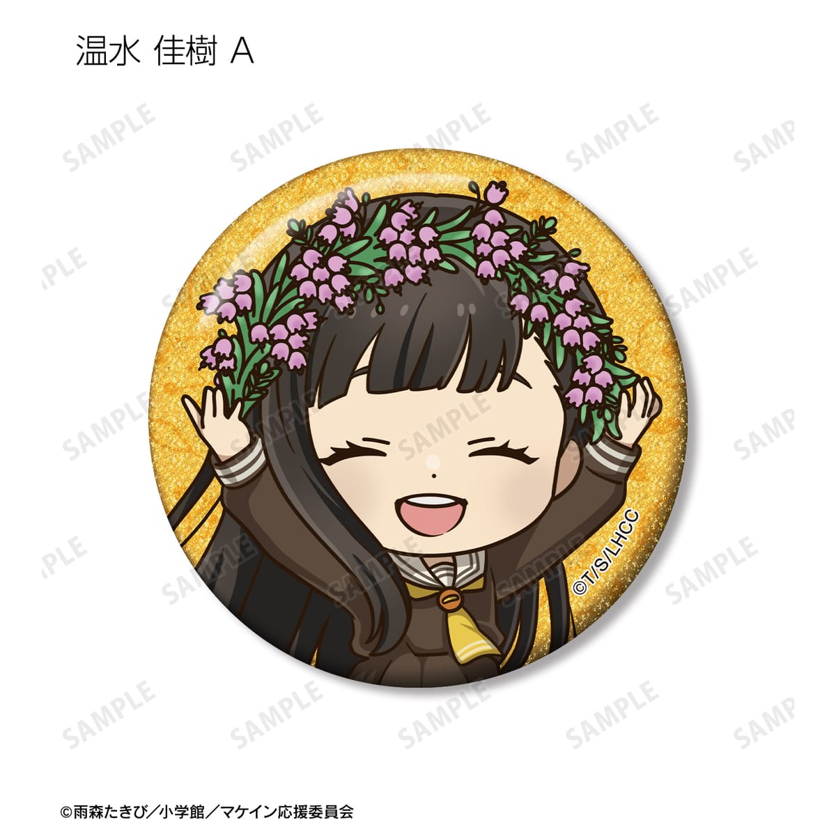 温水 和彦、八奈見 杏菜、焼塩 檸檬、小鞠 知花、温水 佳樹、月之木 古都、姫宮 華恋、朝雲 千早、志喜屋 夢子、放虎原 ひばり、馬剃 天愛星の描き起こしちびキャライラストをメインにデザインし、グリッター加工を施した缶バッジに仕上げました。
