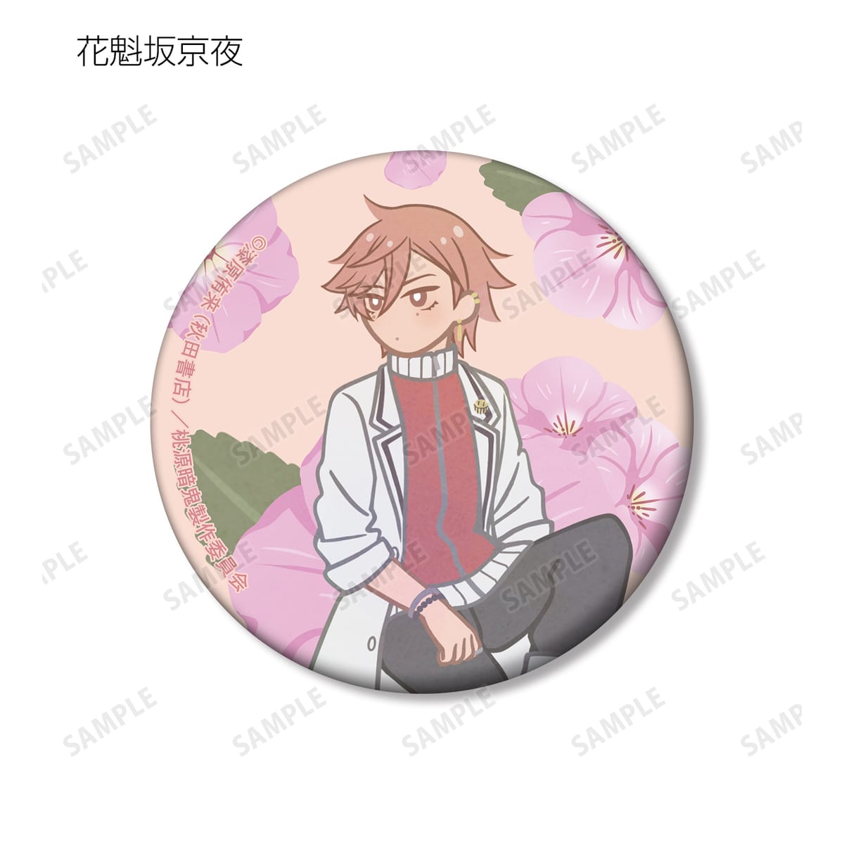 一ノ瀬四季、無陀野無人、皇后崎 迅、花魁坂京夜、淀川真澄、桃寺神門、桃華月詠、桃角桜介のイラストをボタニカルデザインに落とし込んで繊細なタッチで新たに描き起こし、マットな手触りの缶バッジに仕上げました。