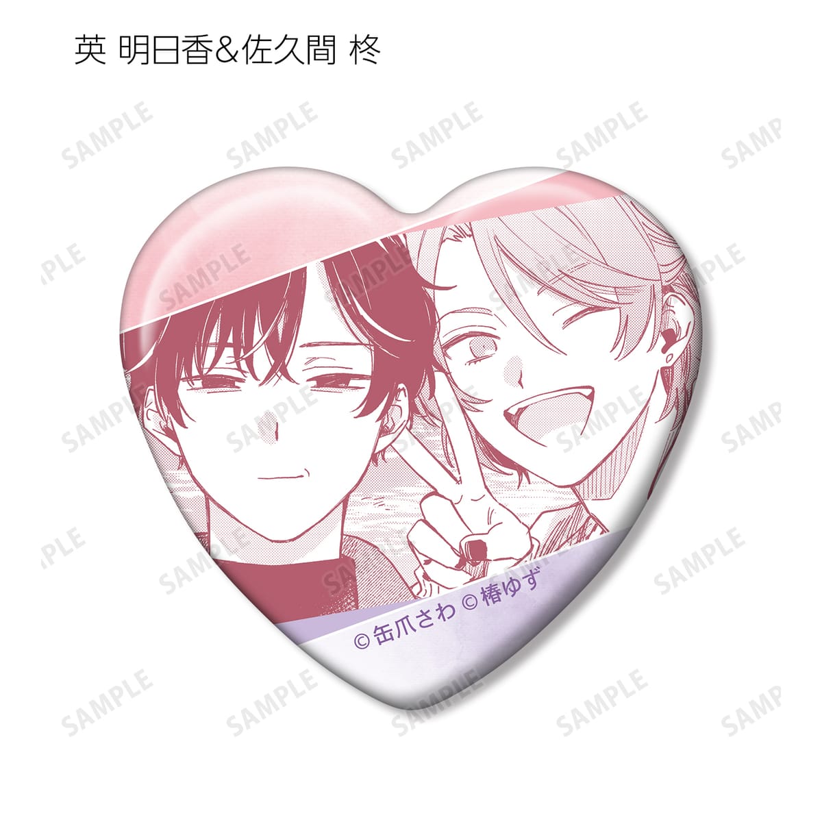 湊 晃、香月 慎太郎、英 明日香、佐久間 柊のカラーイラスト、原作コマをハート型の缶バッジに仕上げました。