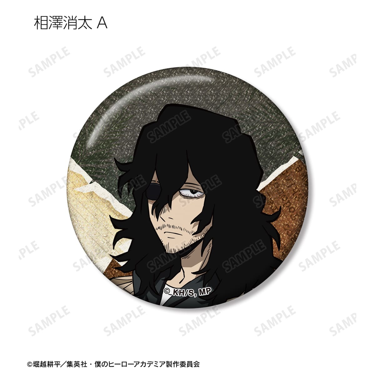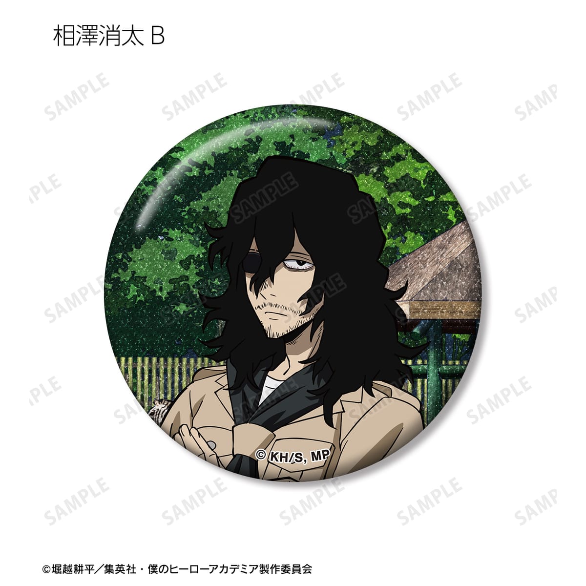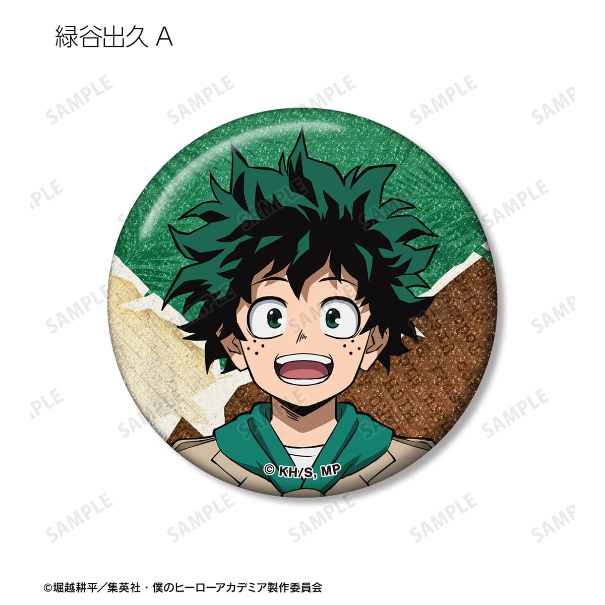 緑谷出久、爆豪勝己、麗日お茶子、轟焦凍、心操人使、相澤消太の描き下ろしビジュアルをグリッター加工を施した缶バッジに仕上げました。
