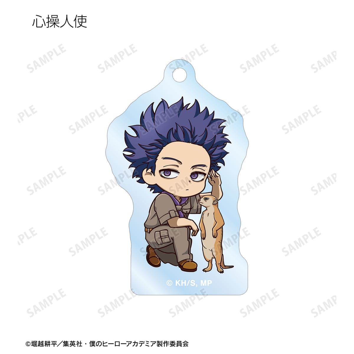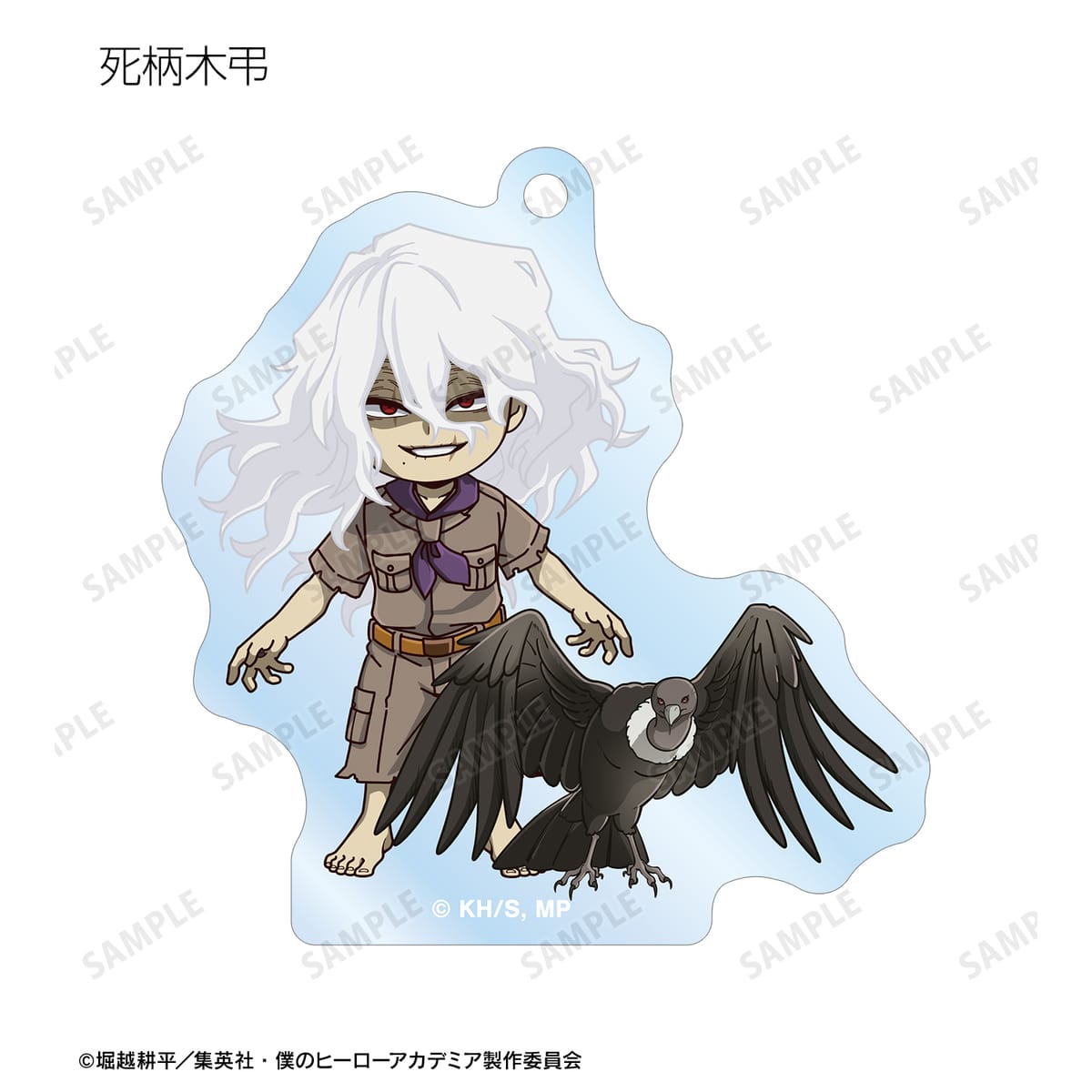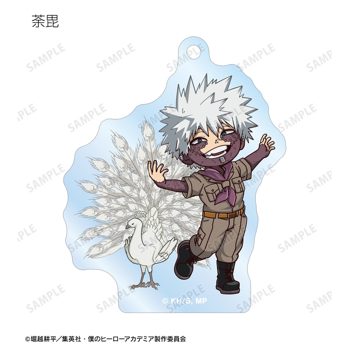 緑谷出久、爆豪勝己、麗日お茶子、轟焦凍、蛙吹梅雨、切島鋭児郎、上鳴電気、耳郎響香、心操人使、オールマイト、相澤消太、エンデヴァー、ホークス、死柄木弔、荼毘、トガヒミコの描き起こしちびキャラビジュアルをメインにデザインし、アクリルキーホルダーに仕上げました。