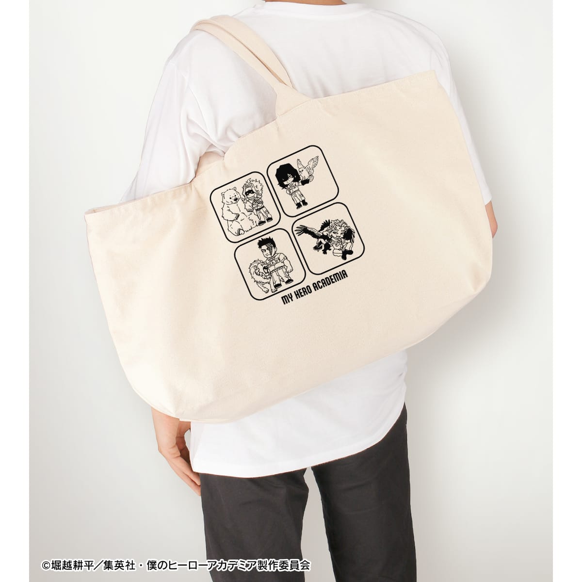 オールマイト、相澤消太、エンデヴァー、ホークスの描き起こしちびキャラビジュアルをメインにデザインし、BIGなジップトートバッグに仕上げました。