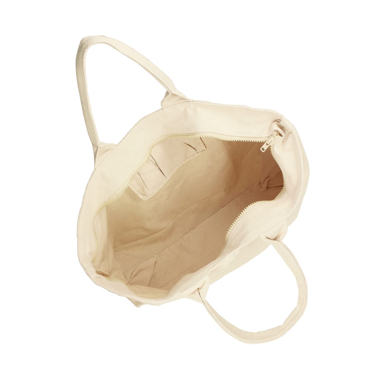 厚みのある生地で、開け口にはジッパーがつき、大容量の収納に適しています。