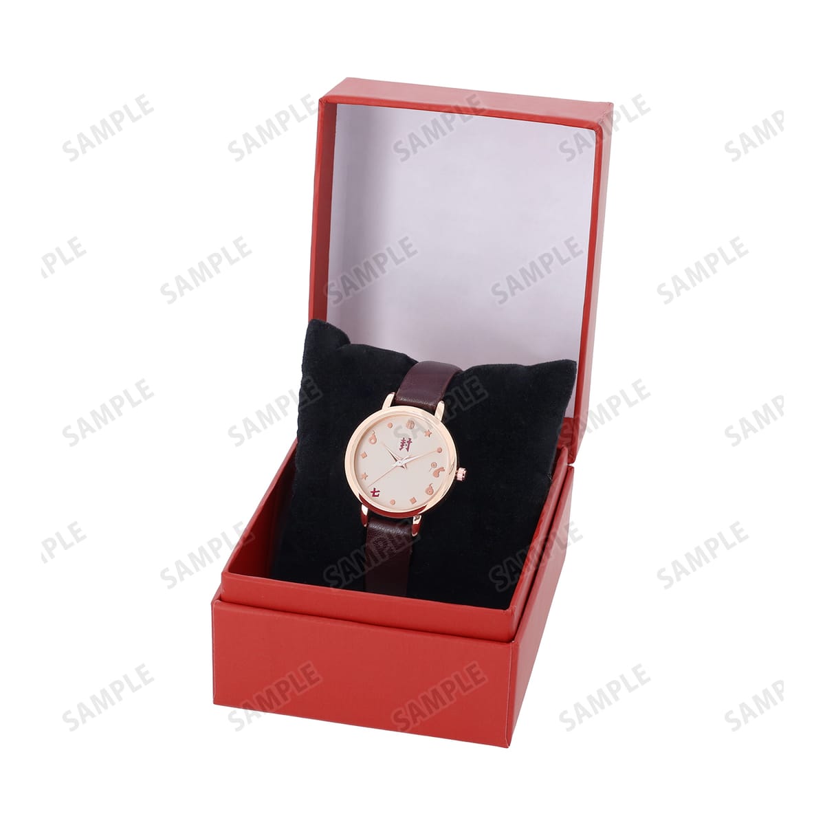 BOXは赤をベースにロゴを箔押しした高級感のあるデザインで、時計をそのまま飾れる仕様です。