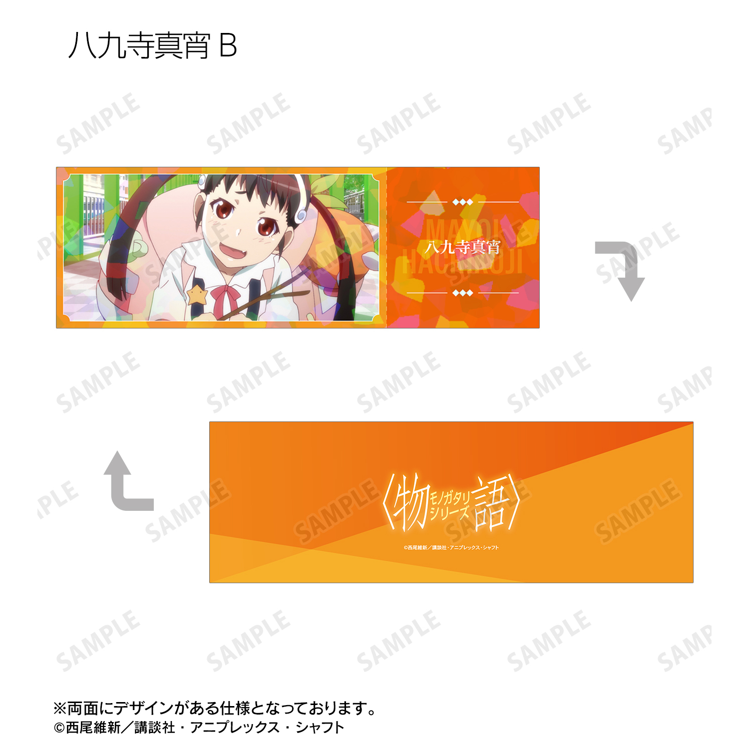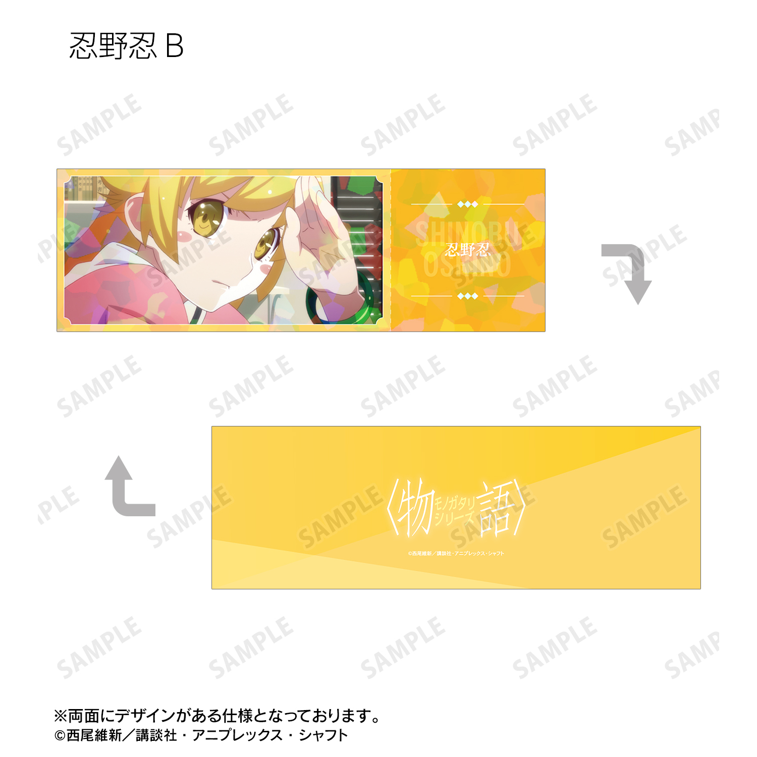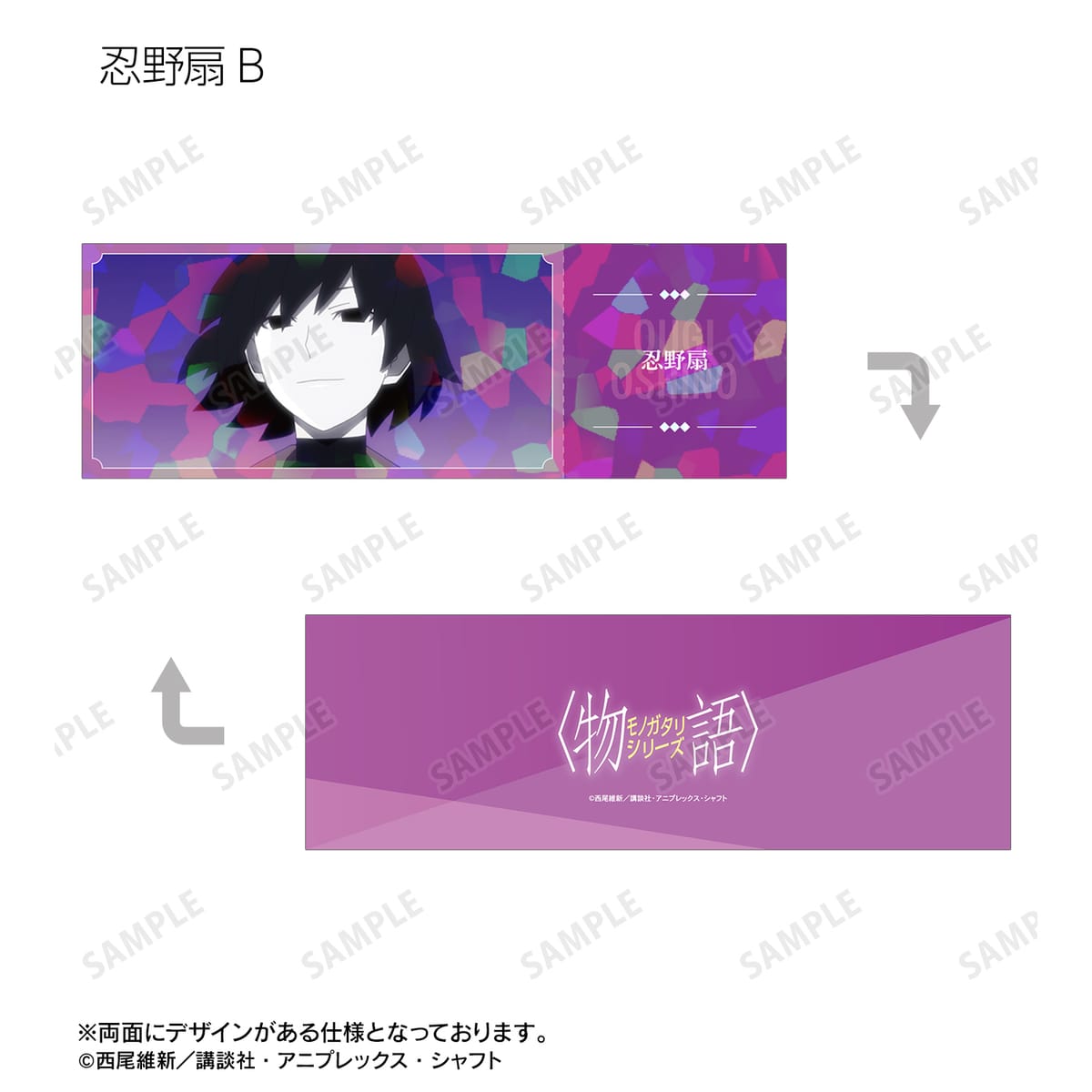 戦場ヶ原ひたぎ、八九寺真宵、神原駿河、千石撫子、羽川翼、阿良々木暦、阿良々木月火、阿良々木火憐、忍野メメ、忍野忍、忍野扇、斧乃木余接の印象的なシーンをホログラムチケット風カードのイラストカードに仕上げました。