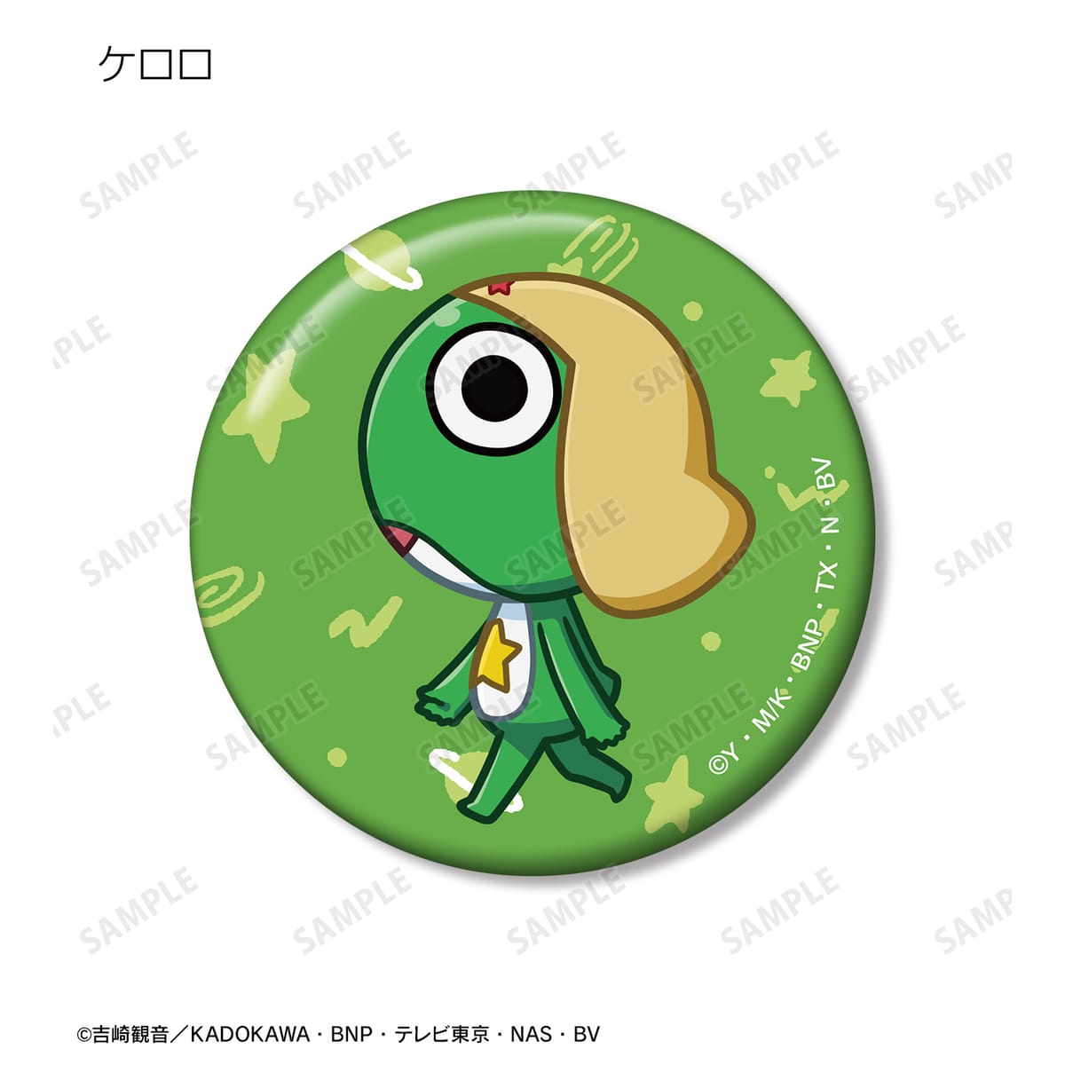 ケロロ、タママ、ギロロ、クルル、ドロロ、ガルル、タルル、トロロ、ゾルル、プルル、日向 冬樹、日向 夏美、西澤 桃華、サブロー、東谷 小雪、アンゴル・モアが歩いているちびキャラを新たに描き起こし、缶バッジに仕上げました。