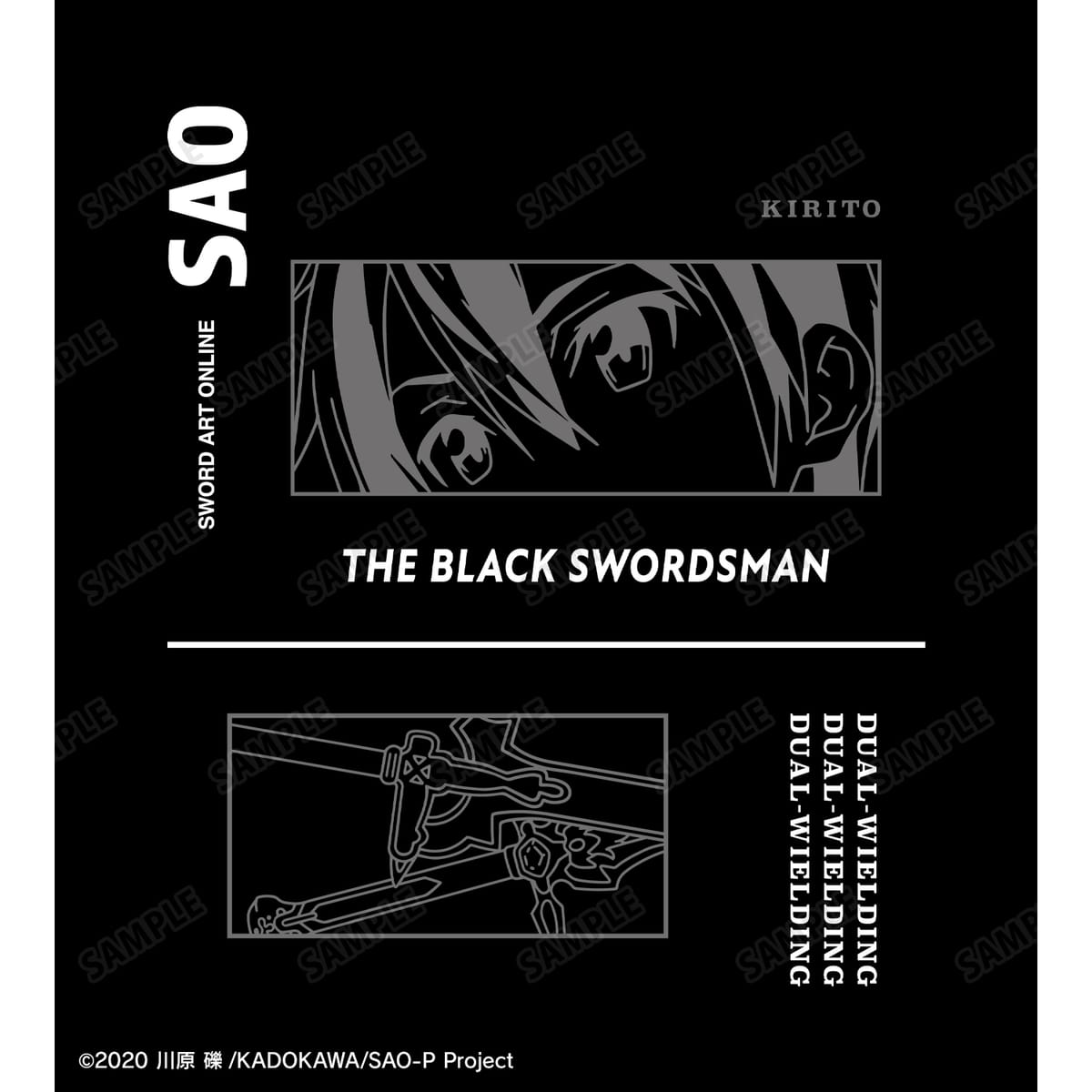 キリトの目元と、二刀流の剣《ダークリパルサー》と《エリュシデータ》を組み合わせ、文字と線画をメインとしたシンプルでスタイリッシュなデザインに仕上げました。
