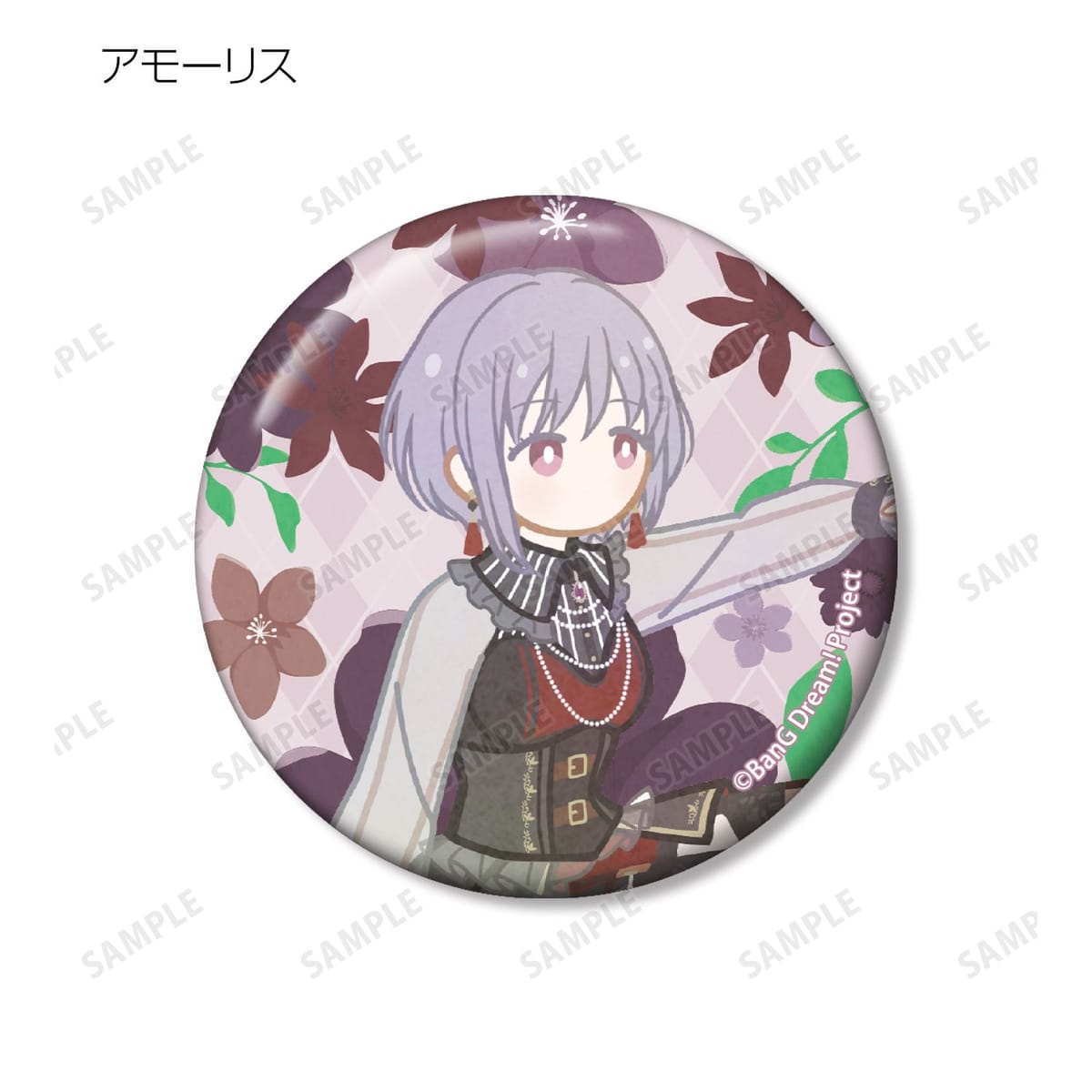 美竹 蘭、青葉 モカ、上原 ひまり、宇田川 巴、羽沢 つぐみ、ドロリス、モーティス、ティモリス、アモーリス、オブリビオニスのイラストをボタニカルデザインに落とし込んで繊細なタッチで新たに描き起こし、缶バッジに仕上げました。