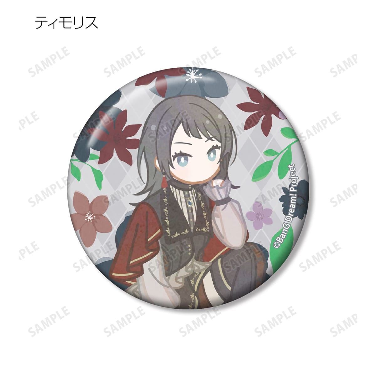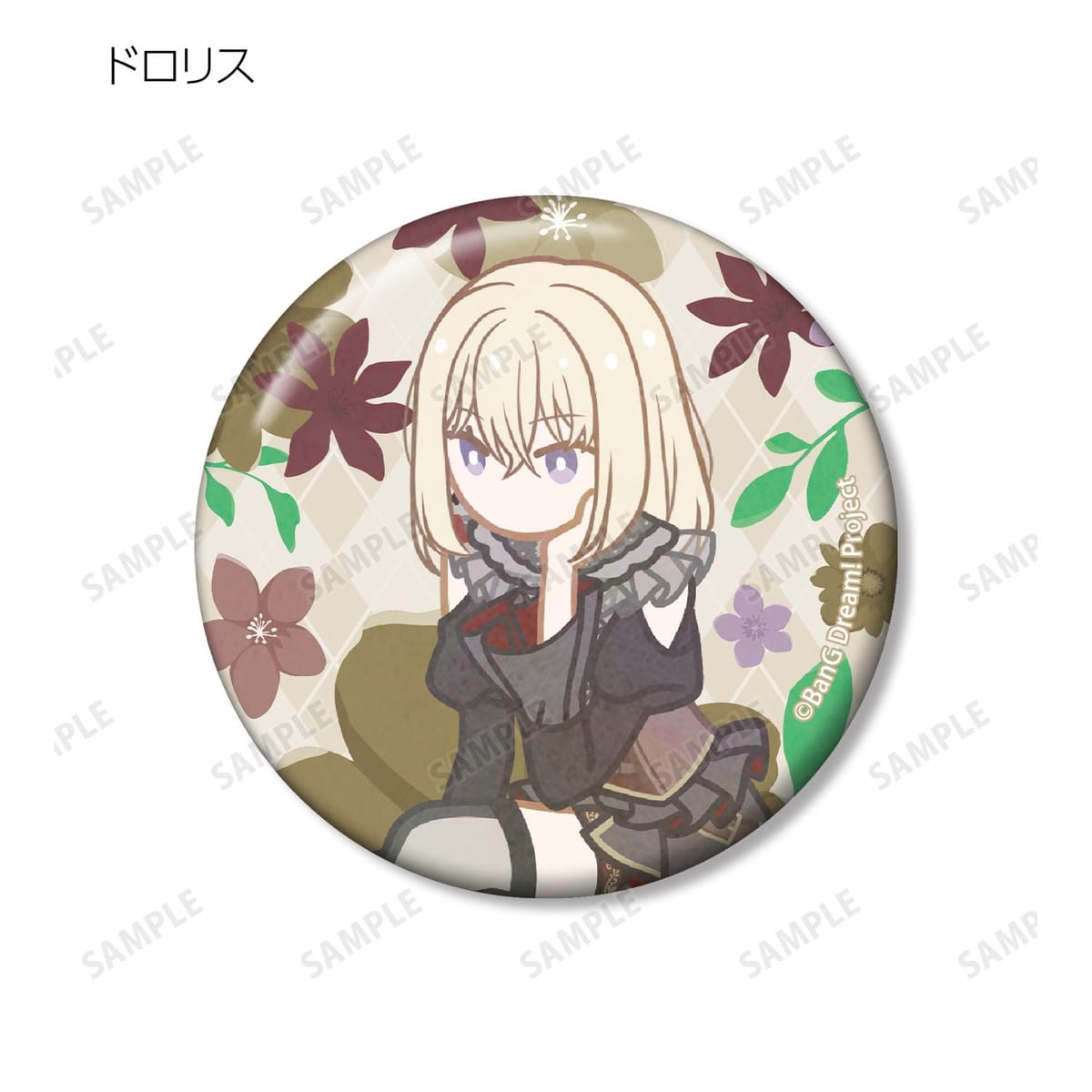美竹 蘭、青葉 モカ、上原 ひまり、宇田川 巴、羽沢 つぐみ、ドロリス、モーティス、ティモリス、アモーリス、オブリビオニスのイラストをボタニカルデザインに落とし込んで繊細なタッチで新たに描き起こし、缶バッジに仕上げました。