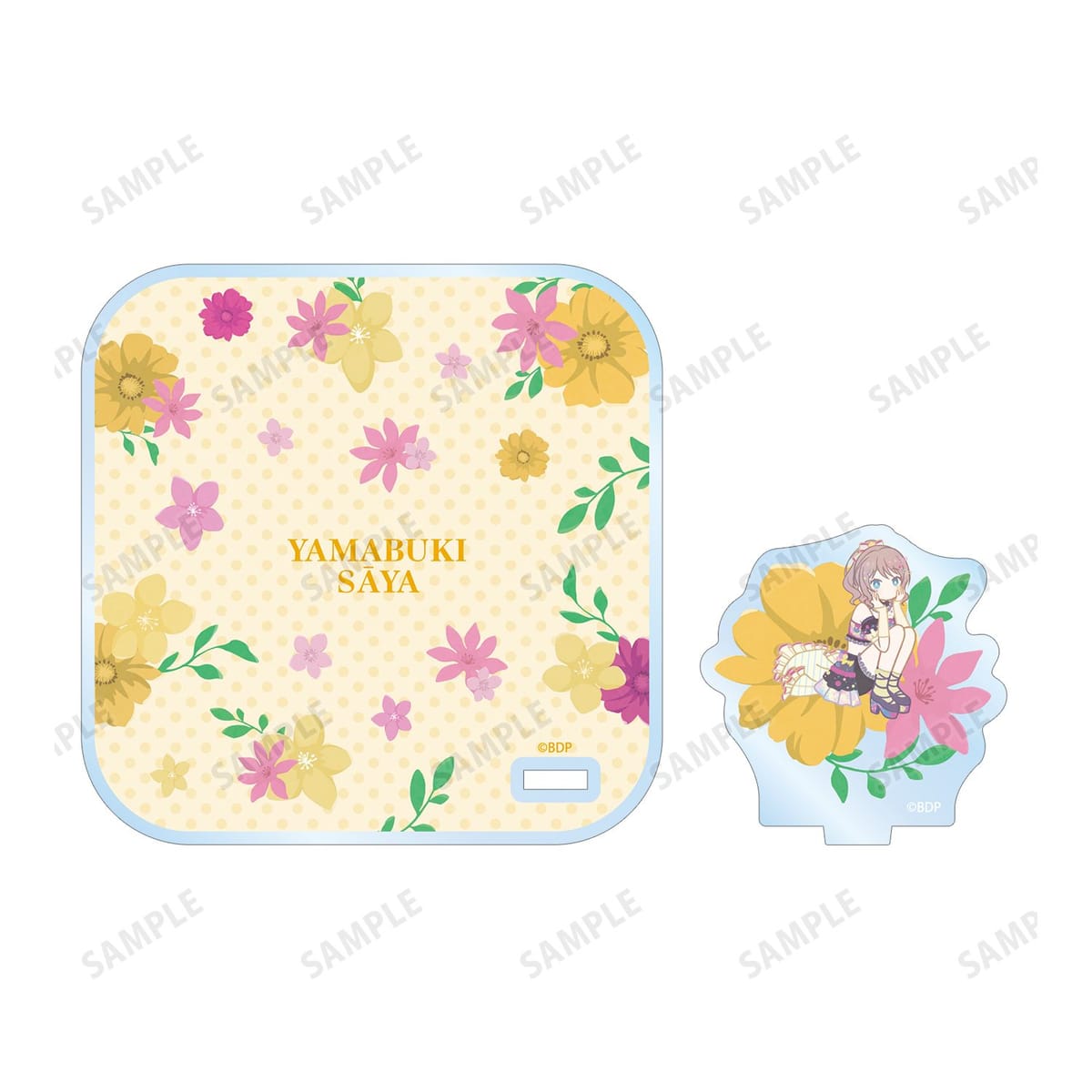 山吹 沙綾のイラストをボタニカルデザインに落とし込んで繊細なタッチで新たに描き起こし、アクリルスタンド付きコースターに仕上げました。