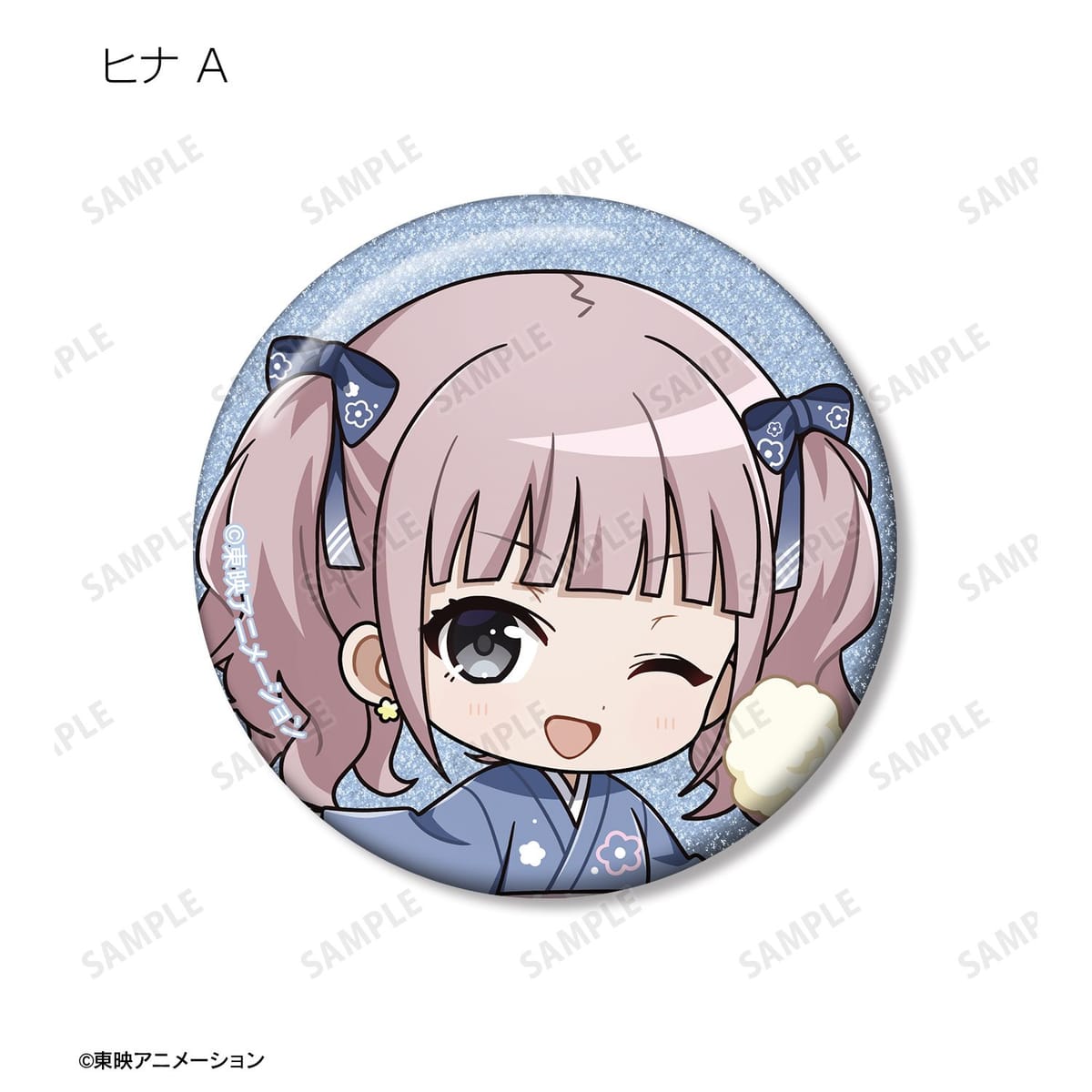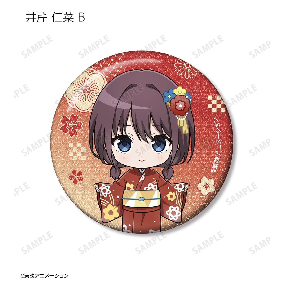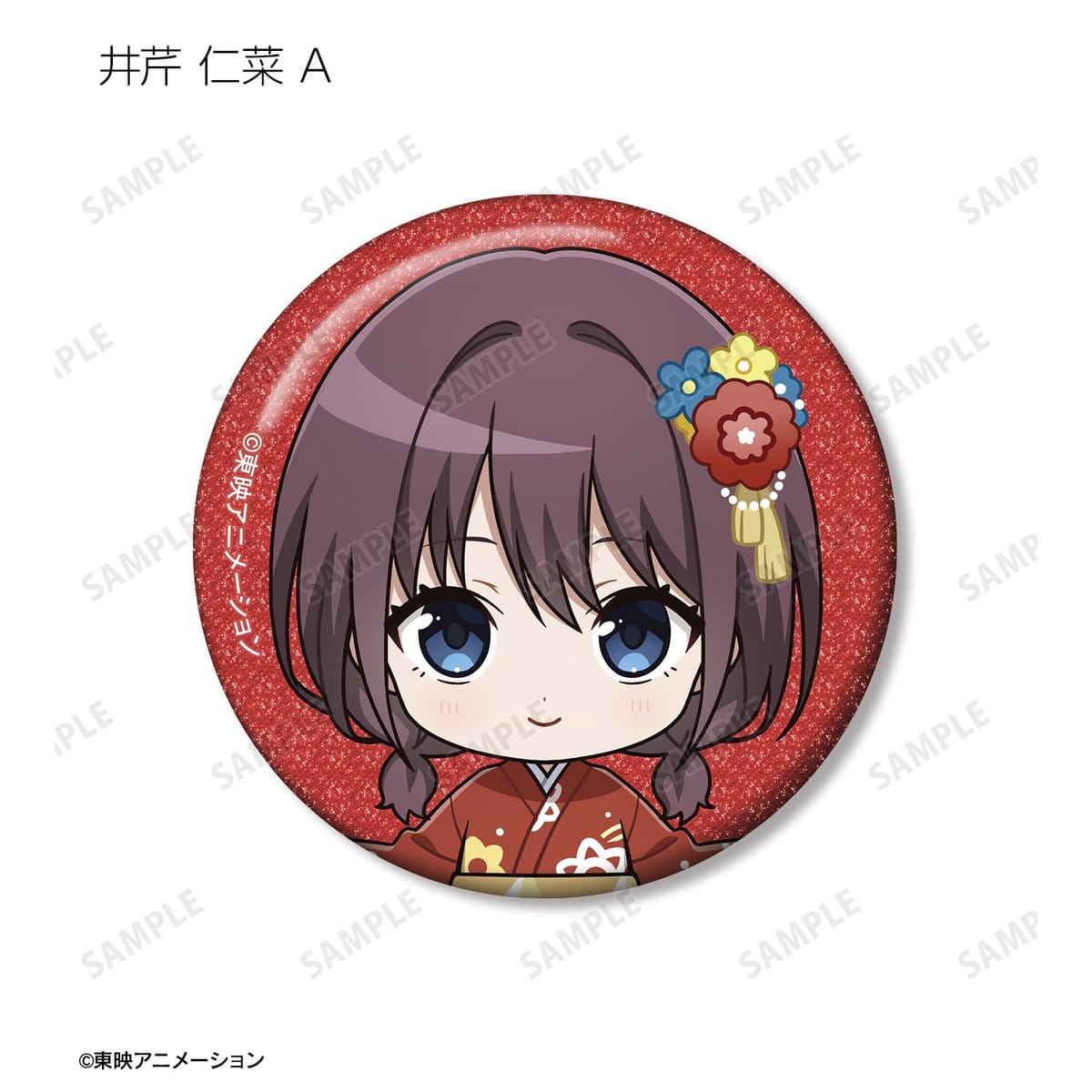 井芹 仁菜、河原木 桃香、安和 すばる、海老塚 智、ルパ、ヒナ、リン、ナナ、アイの描き起こしちびキャライラストをメインにデザインし、グリッター加工を施した缶バッジに仕上げました。