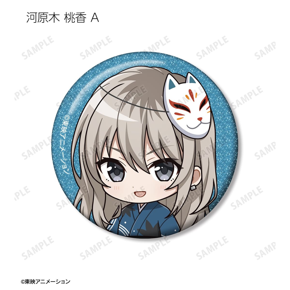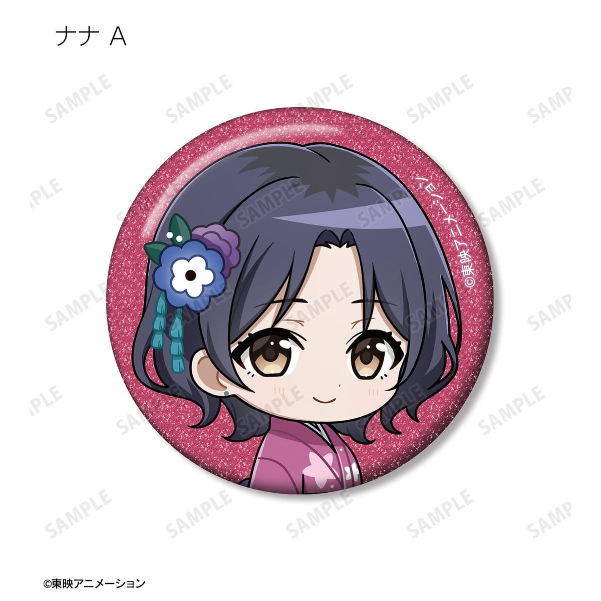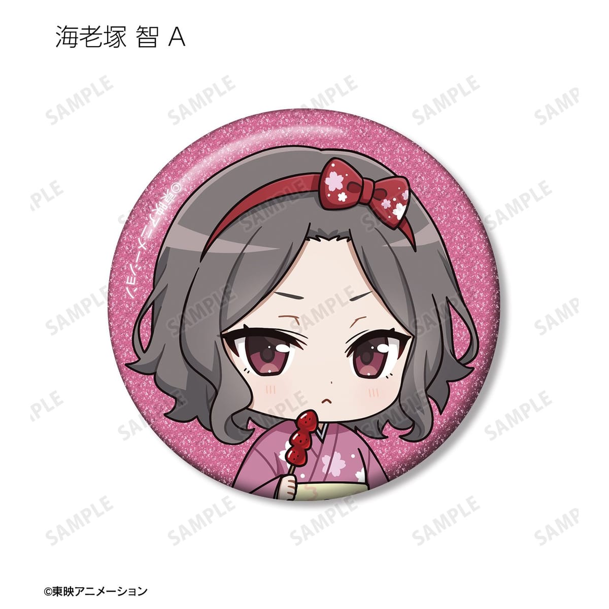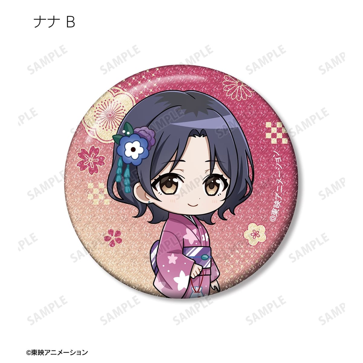 井芹 仁菜、河原木 桃香、安和 すばる、海老塚 智、ルパ、ヒナ、リン、ナナ、アイの描き起こしちびキャライラストをメインにデザインし、グリッター加工を施した缶バッジに仕上げました。