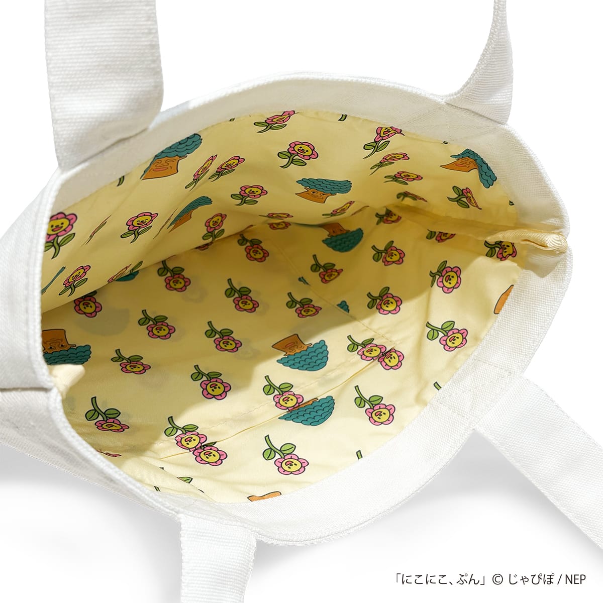 「おかあさんといっしょ」等で活躍した「にこにこぷん」に登場するじゃじゃ丸、ぴっころ、ぽろりをデザインしたトートバッグです。フロントにはキャラクターたちのかわいいイラストをプリント。内側にははなばなガールズやかしの木おじさんなど番組に登場するモチーフを散りばめた総柄デザインをあしらっており、中のデザインにも注目のアイテムです。