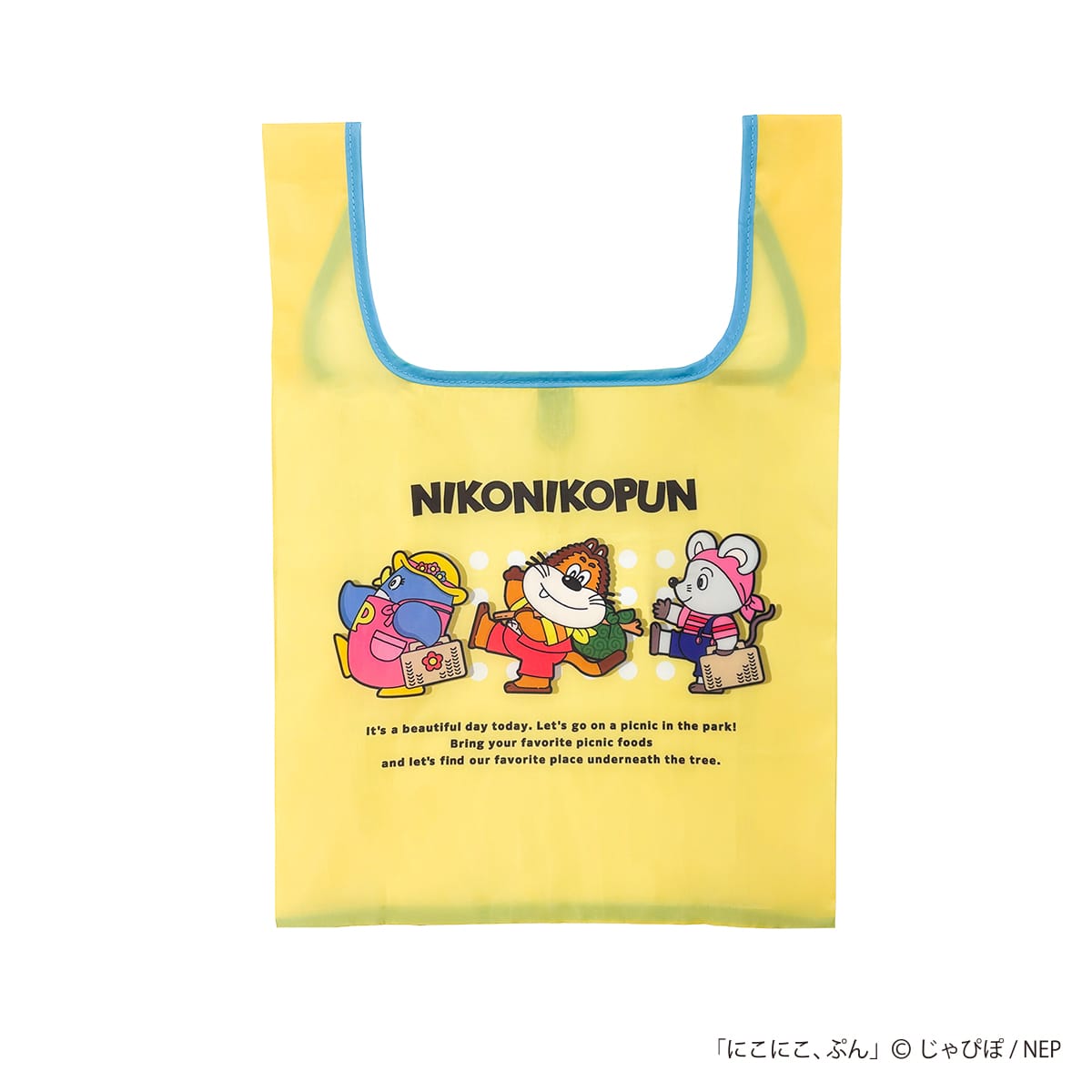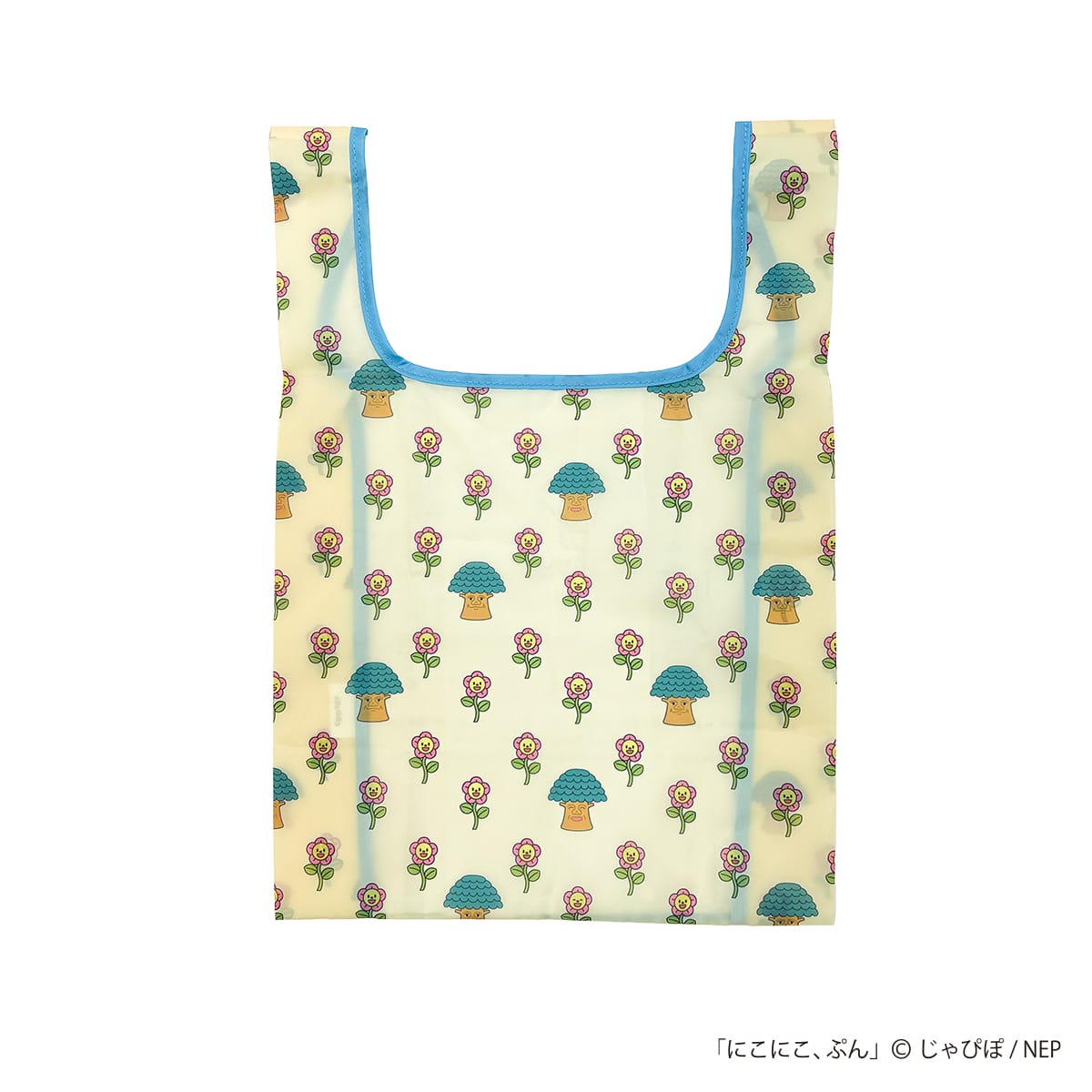 「おかあさんといっしょ」等で活躍した「にこにこぷん」に登場するじゃじゃ丸、ぴっころ、ぽろりをデザインしたエコバッグです。背面にははなばなガールズやかしの木おじさんなどのモチーフを散りばめた総柄デザインをあしらっています。コンパクトに折りたたんで持ち運びできる便利なアイテムです。