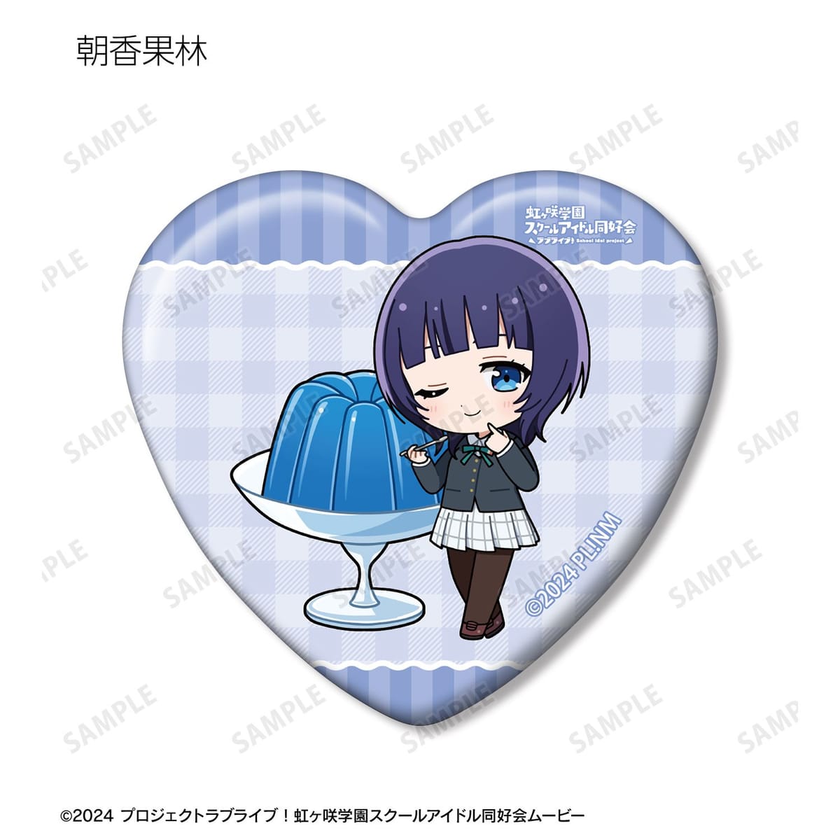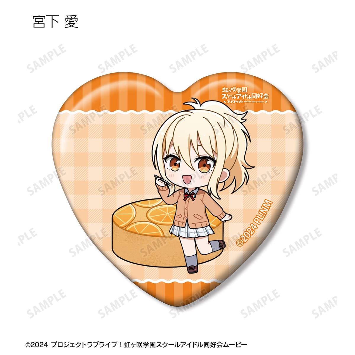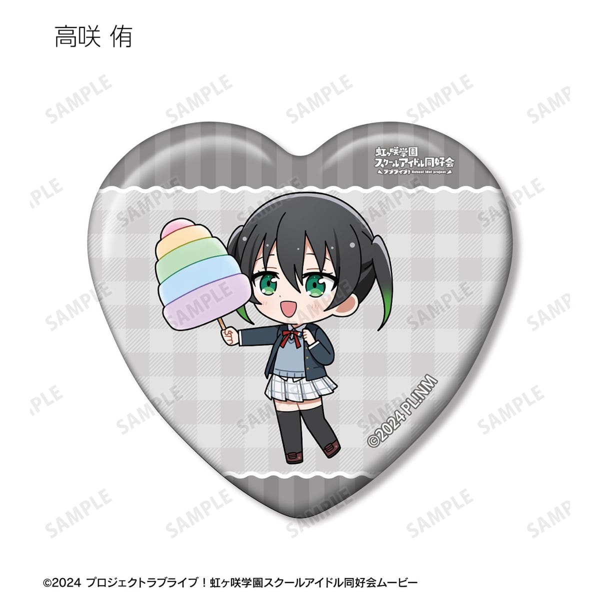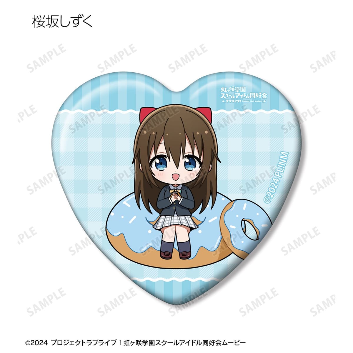 高咲 侑、上原歩夢、中須かすみ、桜坂しずく、朝香果林、宮下 愛、近江彼方、優木せつ菜、エマ・ヴェルデ、天王寺璃奈、三船栞子、ミア・テイラー、鐘 嵐珠のちびキャライラストをメインにデザインし、ハート型の缶バッジに仕上げました。