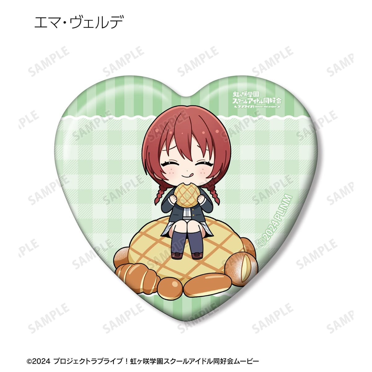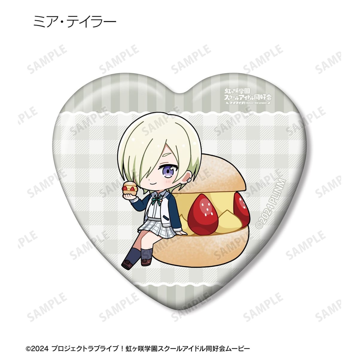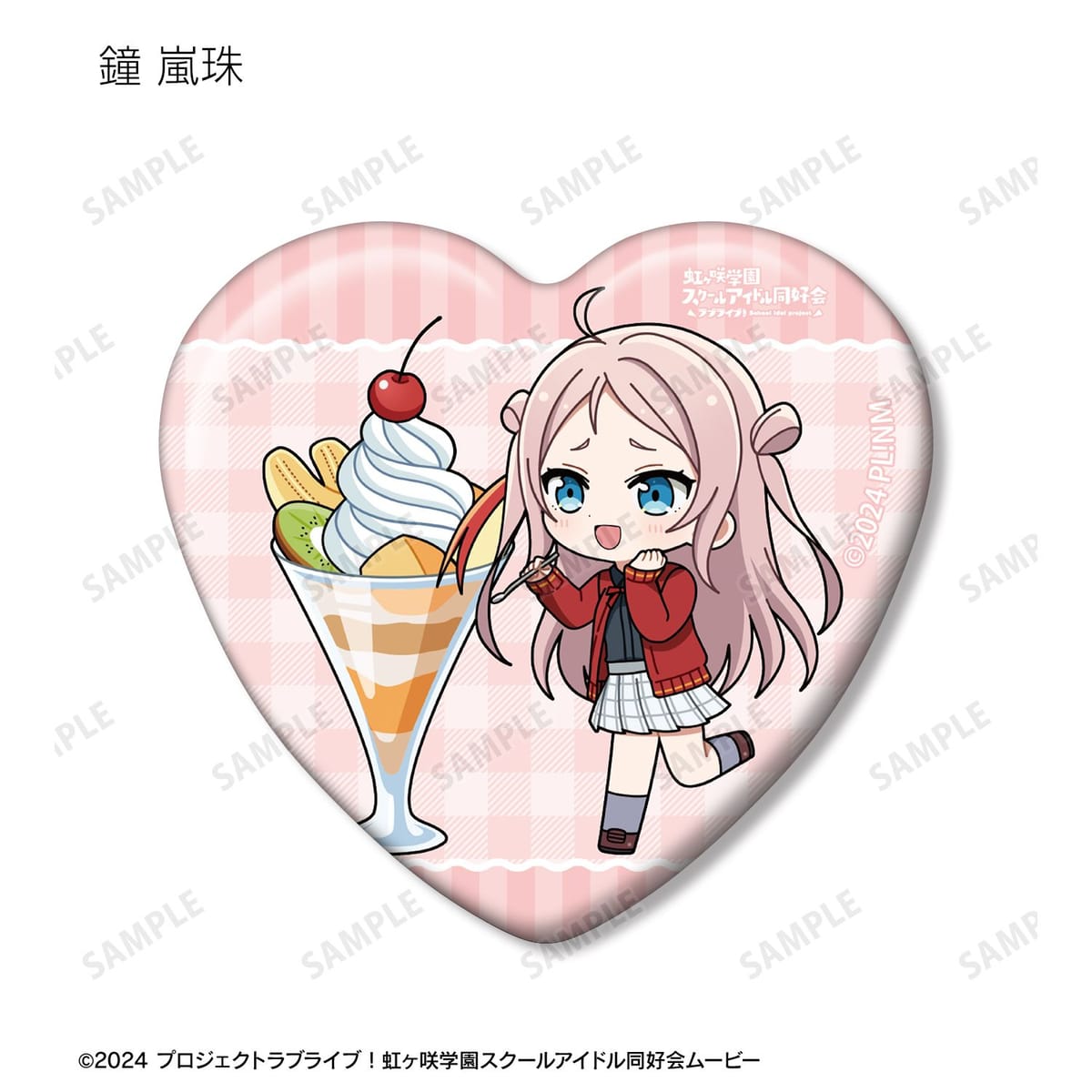 高咲 侑、上原歩夢、中須かすみ、桜坂しずく、朝香果林、宮下 愛、近江彼方、優木せつ菜、エマ・ヴェルデ、天王寺璃奈、三船栞子、ミア・テイラー、鐘 嵐珠のちびキャライラストをメインにデザインし、ハート型の缶バッジに仕上げました。