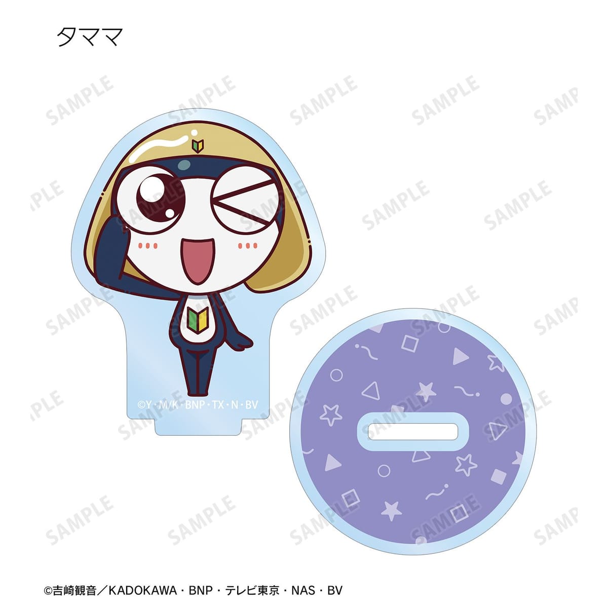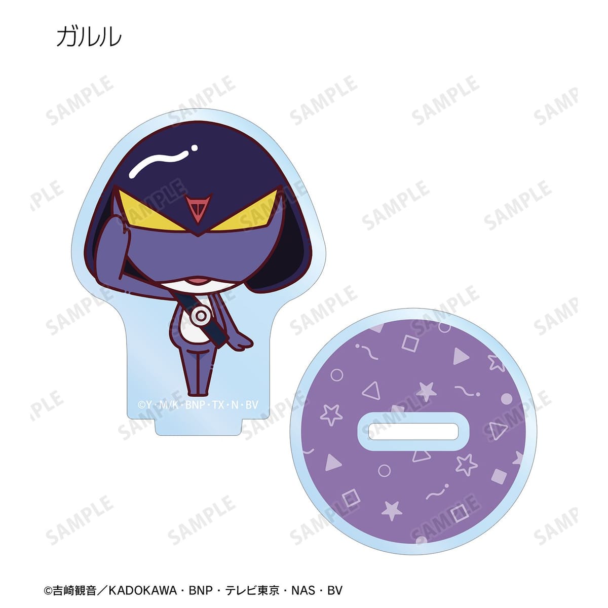 ケロロ、タママ、ギロロ、クルル、ドロロ、ガルル、タルル、トロロ、ゾルル、プルル、冬樹、夏美、桃華、サブロー、小雪がちょこんと立っているちびキャラを新たに描き起こし、アクリルスタンドに仕上げました。