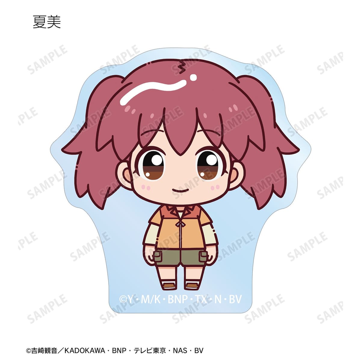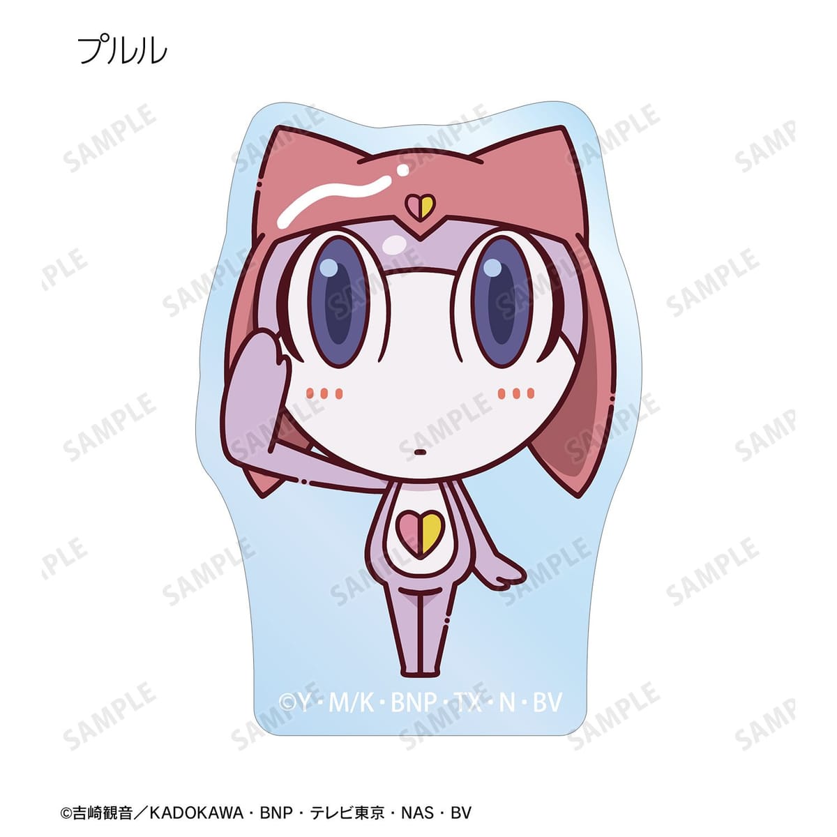 ケロロ、タママ、ギロロ、クルル、ドロロ、ガルル、タルル、トロロ、ゾルル、プルル、冬樹、夏美、桃華、サブロー、小雪がちょこんと立っているちびキャラを新たに描き起こし、アクリルステッカーに仕上げました。