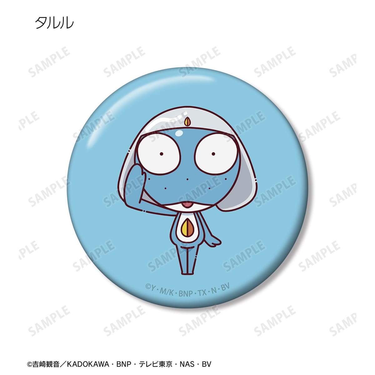 ケロロ、タママ、ギロロ、クルル、ドロロ、ガルル、タルル、トロロ、ゾルル、プルル、冬樹、夏美、桃華、サブロー、小雪がちょこんと立っているちびキャラを新たに描き起こし、缶バッジに仕上げました。