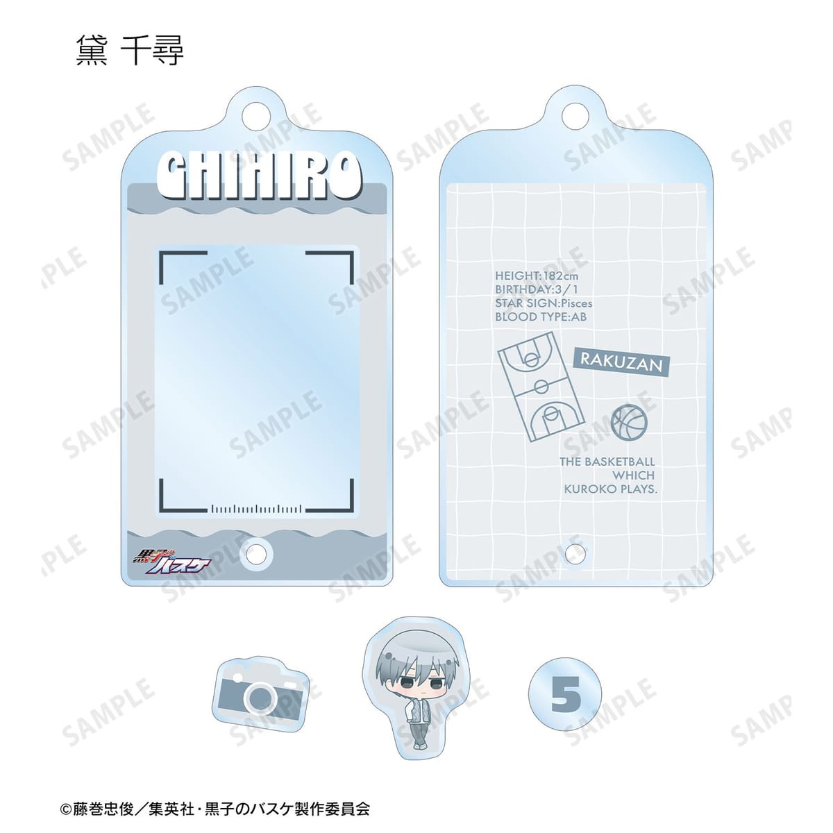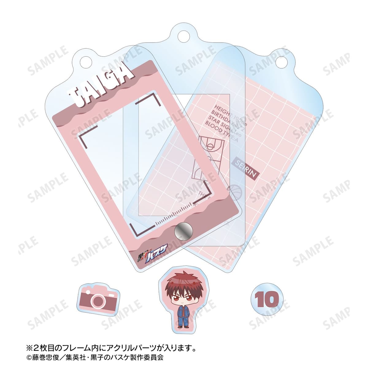 アクリルフレームの中に、火神大我、笠松幸男、高尾和成、今吉翔一、氷室辰也、黛 千尋の描き起こしちびキャライラストの小さなパーツが入っている、パーツ付きフレームアクリルチャームです。
