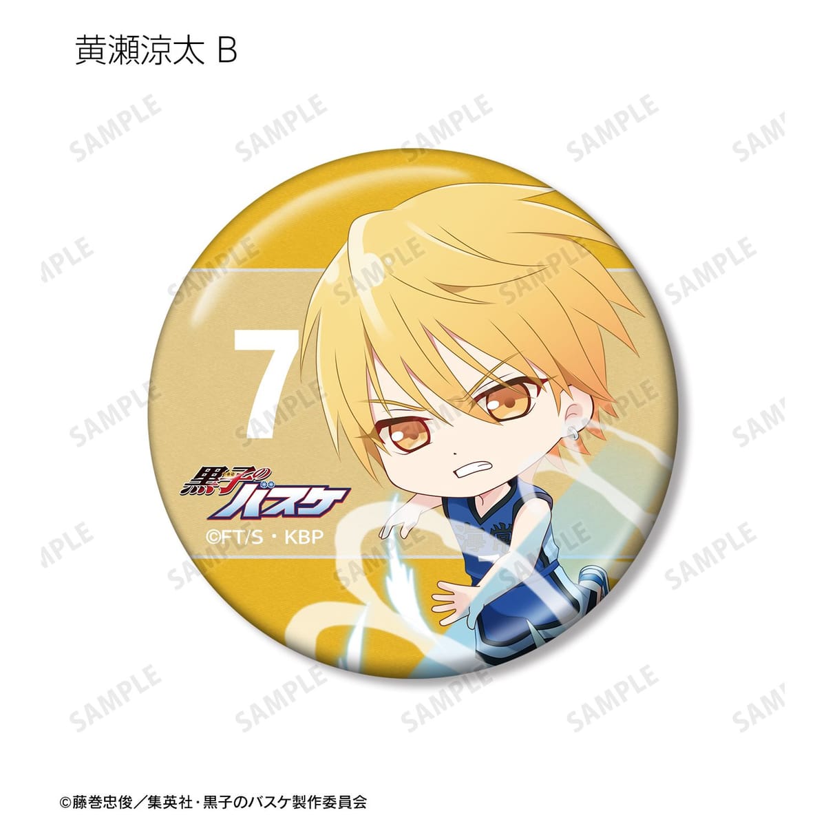 黒子テツヤ、火神大我、黄瀬涼太、緑間真太郎、青峰大輝、紫原 敦、赤司征十郎の描き起こしちびキャライラストと各キャラクターの背番号をメタリック仕様の缶バッジに仕上げました。