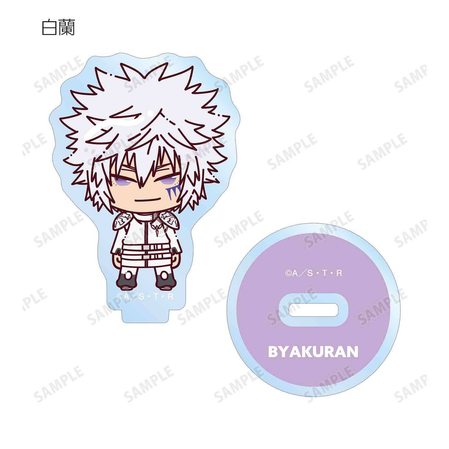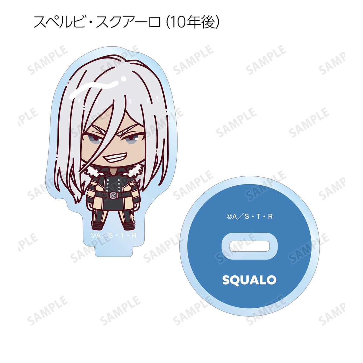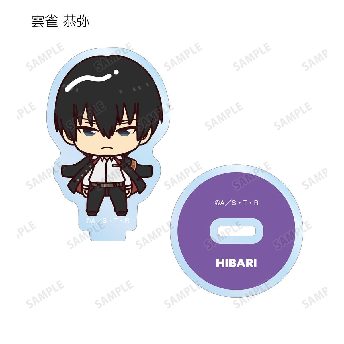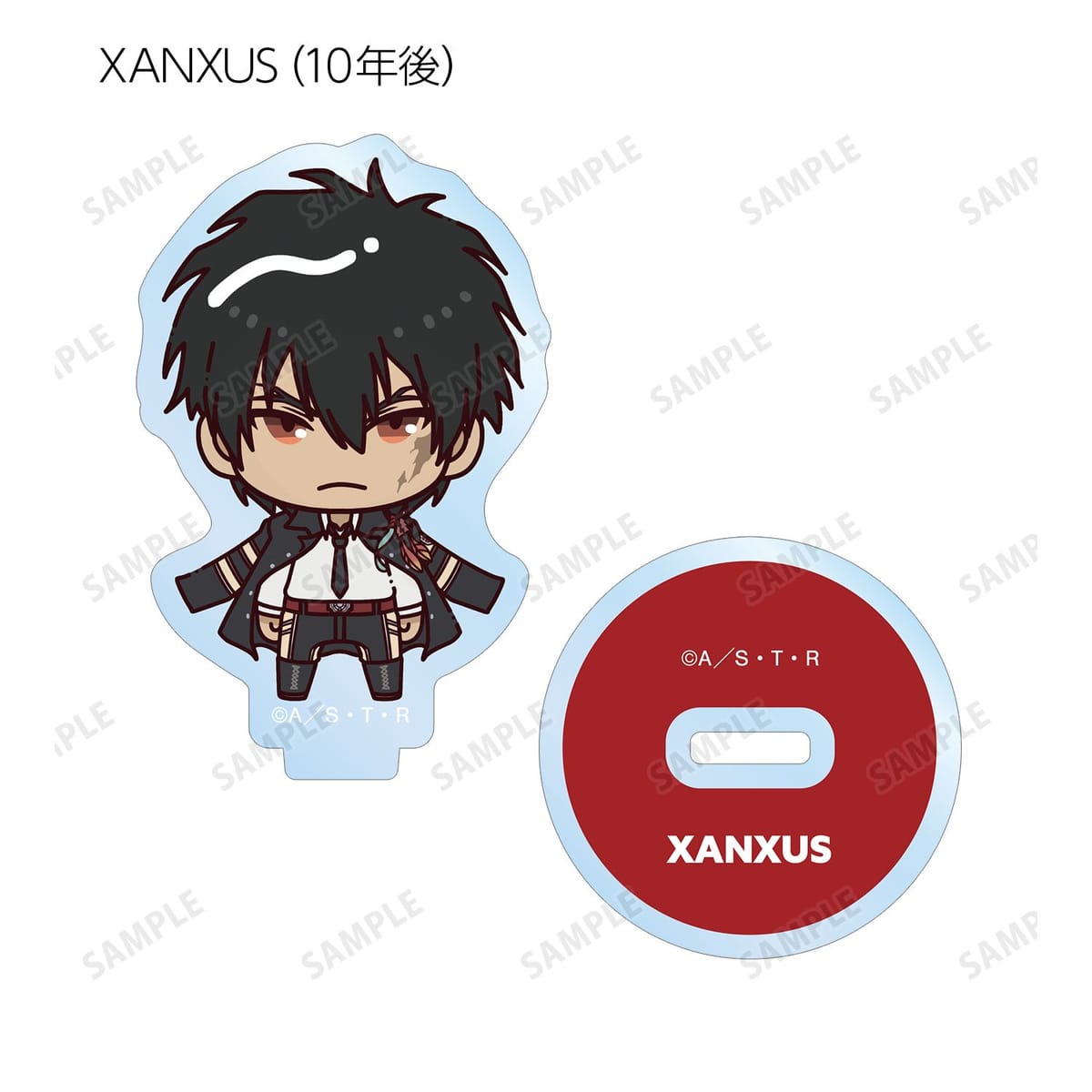リボーン、沢田 綱吉、獄寺 隼人、山本 武、雲雀 恭弥、六道 骸(10年後)、XANXUS(10年後)、スペルビ・スクアーロ(10年後)、ベルフェゴール(10年後)、フラン、白蘭がちょこんと立っているちびキャラを新たに描き起こし、アクリルスタンドに仕上げました。