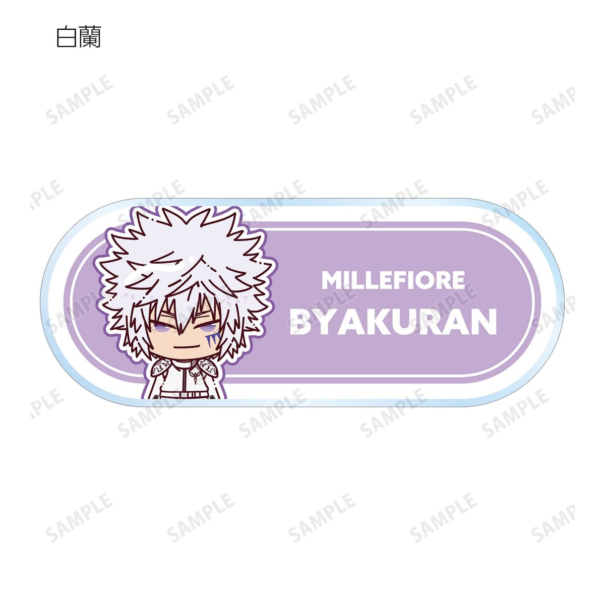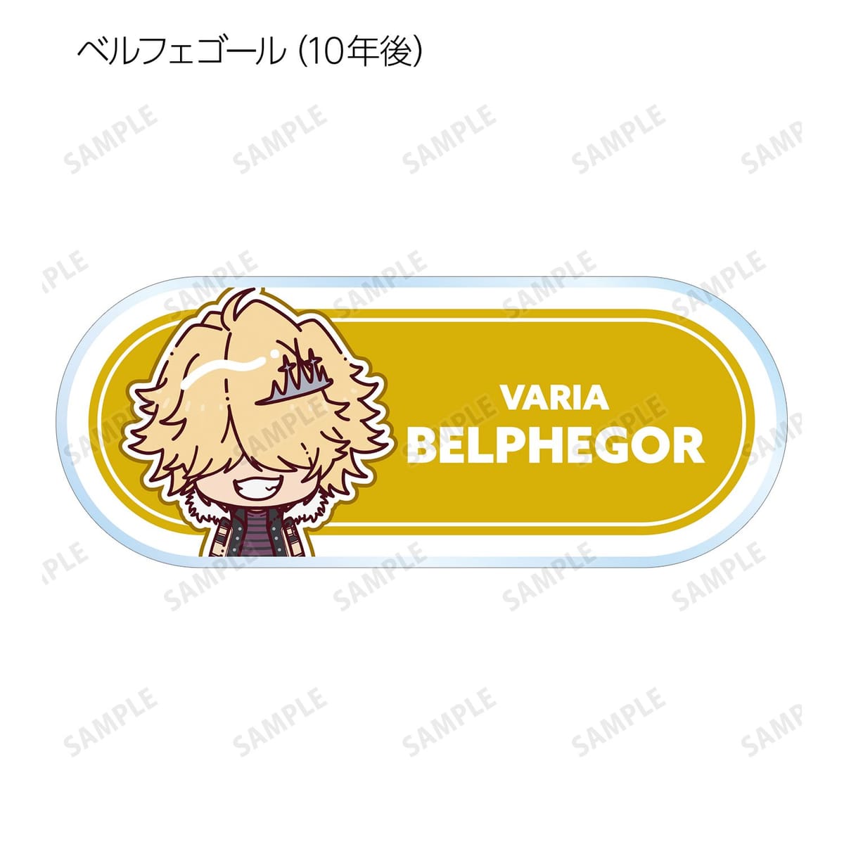 リボーン、沢田 綱吉、獄寺 隼人、山本 武、雲雀 恭弥、六道 骸(10年後)、XANXUS(10年後)、スペルビ・スクアーロ(10年後)、ベルフェゴール(10年後)、フラン、白蘭がちょこんと立っているちびキャラを新たに描き起こし、アクリルネームプレートに仕上げました。