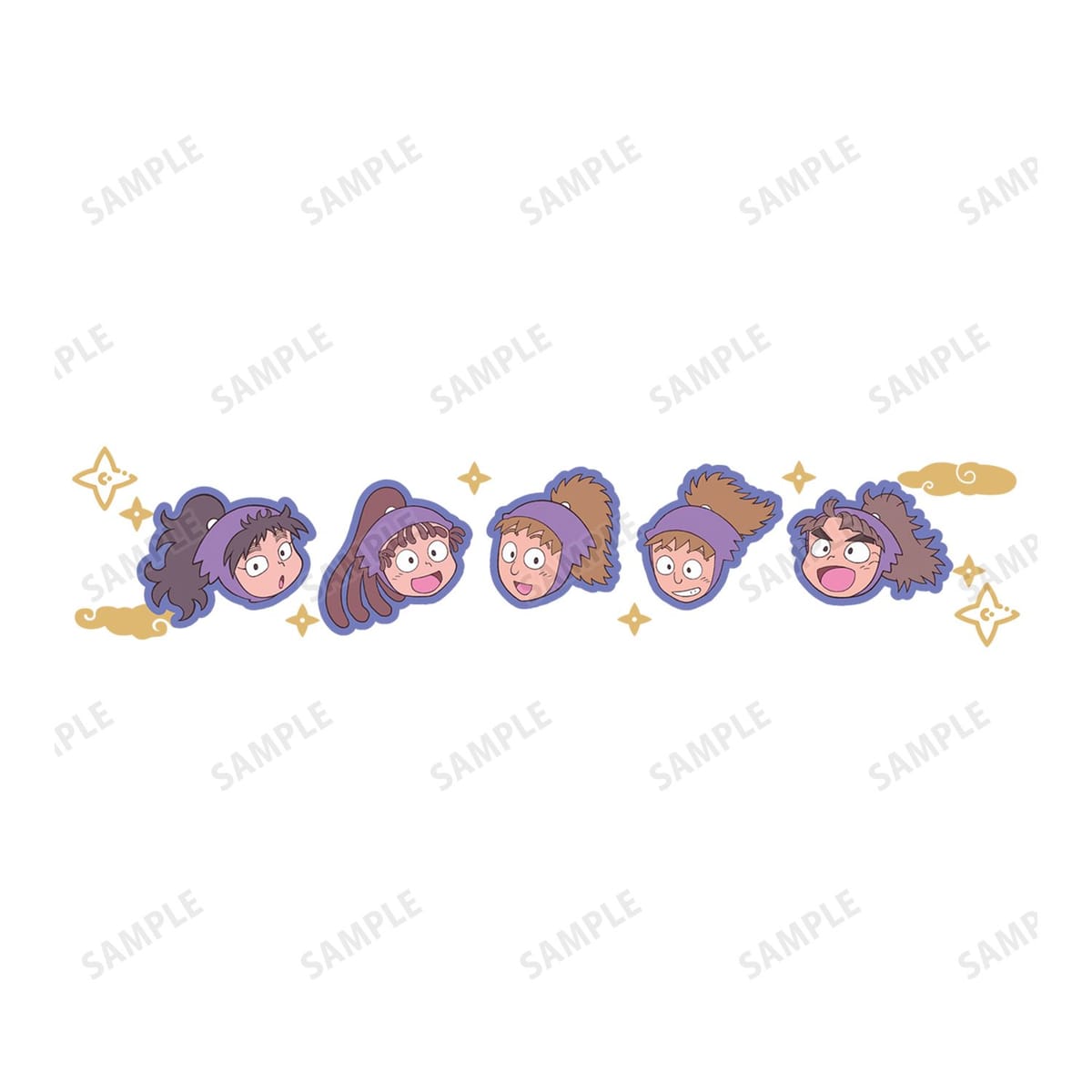 久々知兵助、尾浜勘右衛門、不破雷蔵、鉢屋三郎、竹谷八左ヱ門のミニキャライラスト、各キャラクターのモチーフをチークブラシに仕上げました。