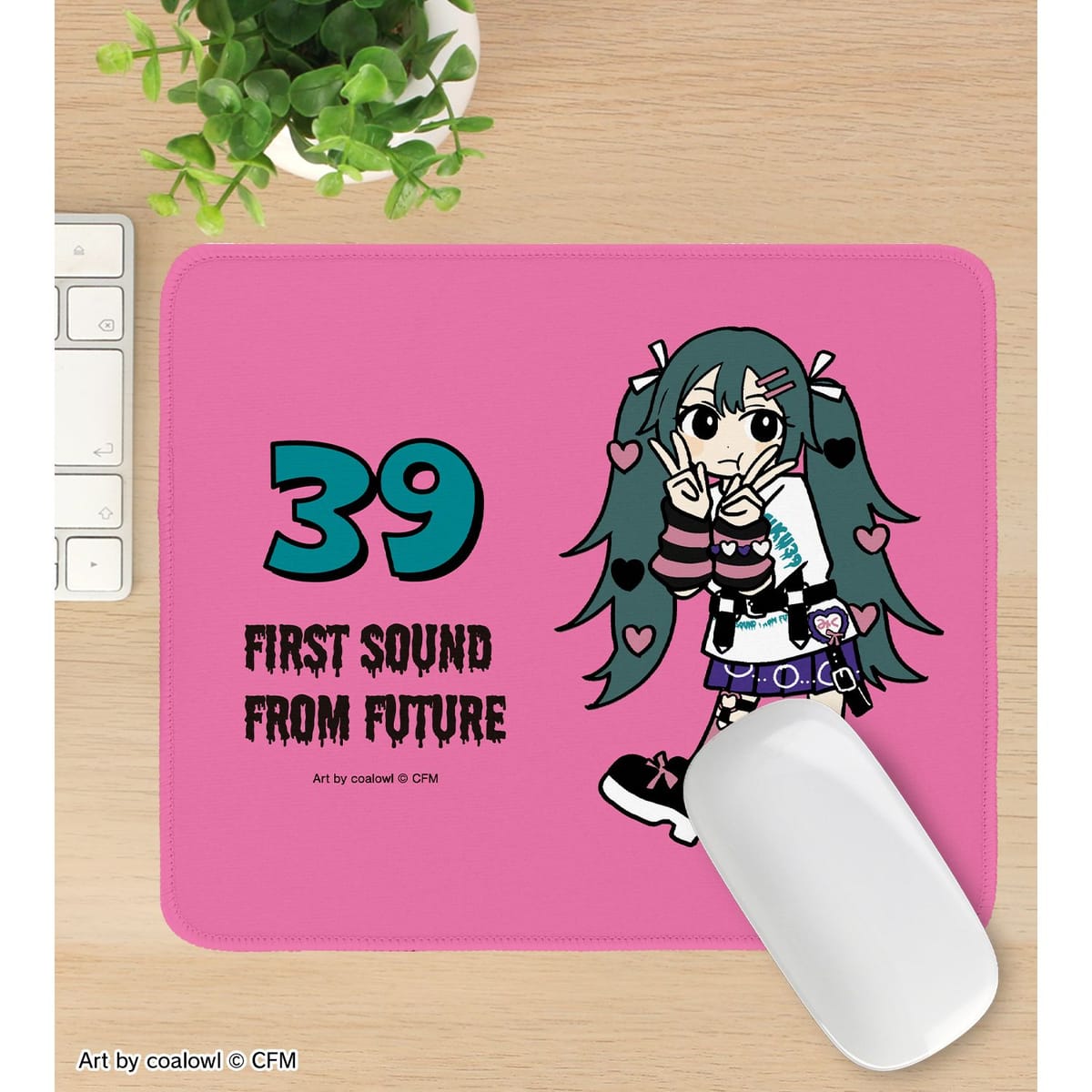 coalowlさん描き下ろしの初音ミクのデフォルメイラスト、「39」の数字、着用イラストに書かれた英字をマウスパッドに仕上げました。