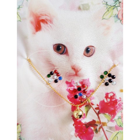 前身の内側は猫ちゃんのまわりにフラワービーズと鈴チャームをネックレス風にデザイン!