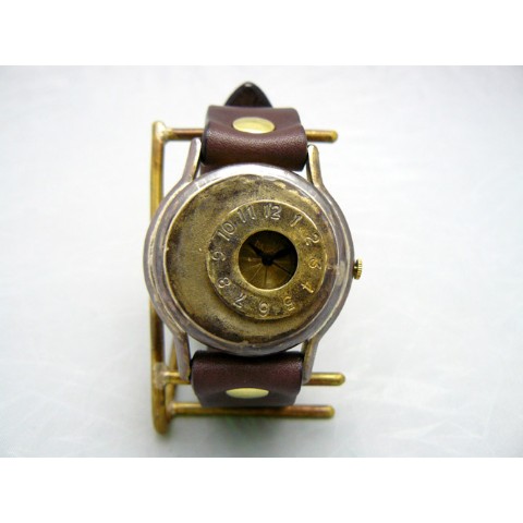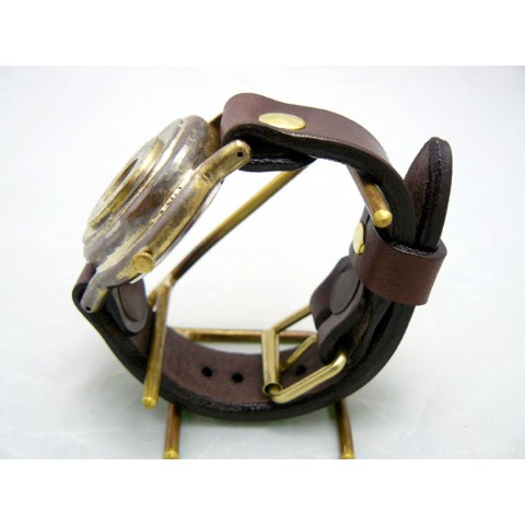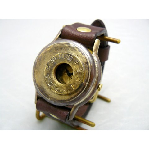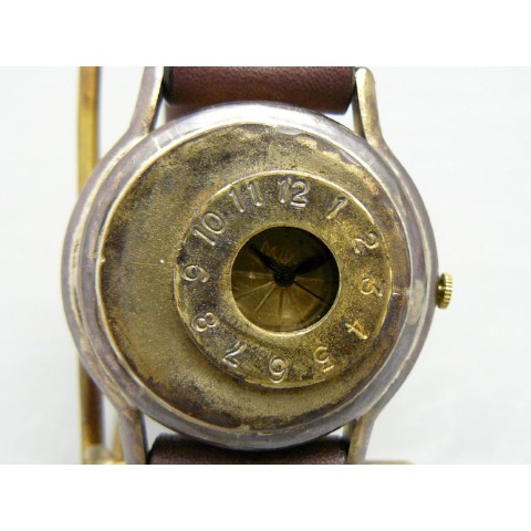 右側にオフセットされた時間表示が個性的なジャンボサイズモデル。古美仕上げされた真鍮ケースでスチームパンクな雰囲気満点なモデル。非防水です。 ご注文から制作しますので、お届けまでに約3週間から1か月程お時間を頂きます。