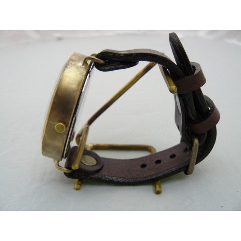 本体素材:Brass(真鍮) ベルト素材:本牛革 強化プラスチック風防 最大ケース幅(横)50mm・最少ケース幅(縦)約50mm 厚さ約12mm・全長約28cm・ベルト幅約20mm 対応手首周り約16.5cm?約21cm 日本製シチズン社クオーツムーブメント使用。電池交換可能。非防水(水にはご注意下さい)。 保証期間:1年間