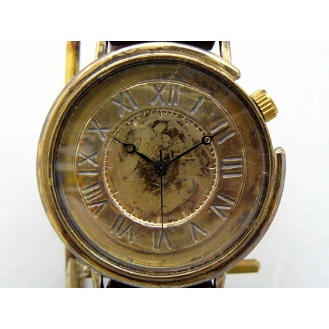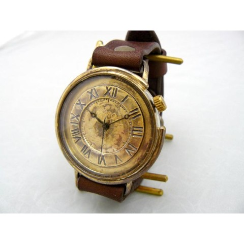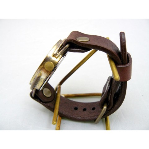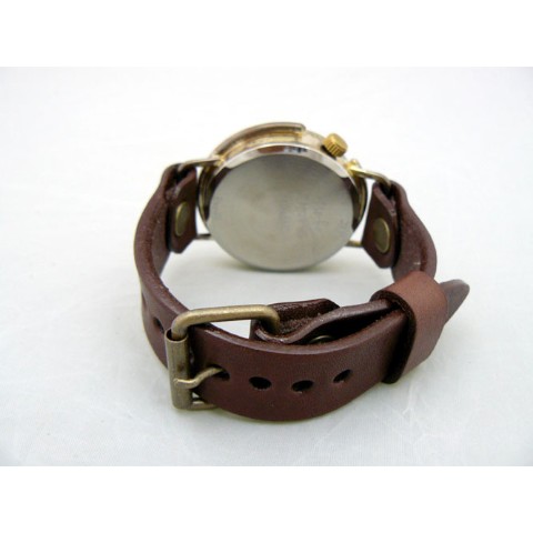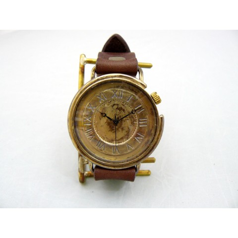 本体素材:Brass(真鍮) ベルト素材:本牛革 ミネラルガラス風防 最大ケース幅45mm・最少ケース幅約40mm 厚さ約10mm・全長約28cm・ベルト幅約20mm 対応手首周り約16.5cm?約21cm 日本製シチズン社クオーツムーブメント使用。電池交換可能。非防水(水にはご注意下さい)。 保証期間:1年間