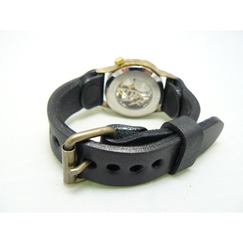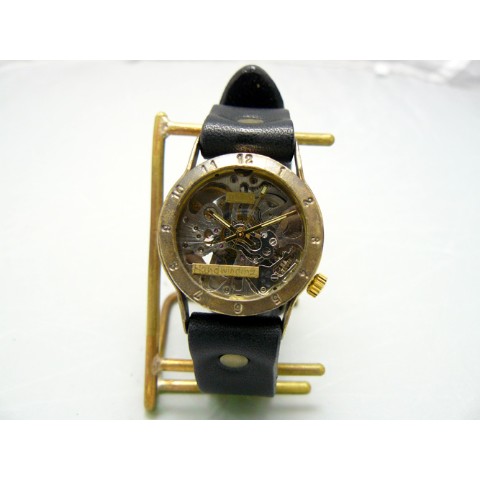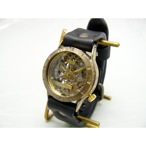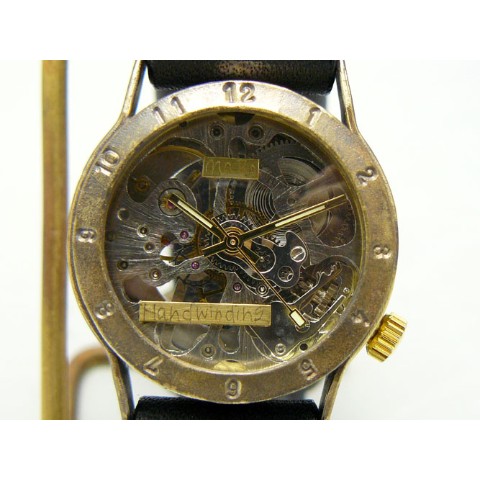 機械式手巻きモデル。機械の動きが楽しめる裏表スケルトン仕様です。真鍮の素材感と機械式ムーブメントのレトロ感が絶妙にマッチしています。ケース直径約32mmですので、男女を問わないユニセックスモデルです。リューズを4時位置にずらし、手首への当りを軽減しています。