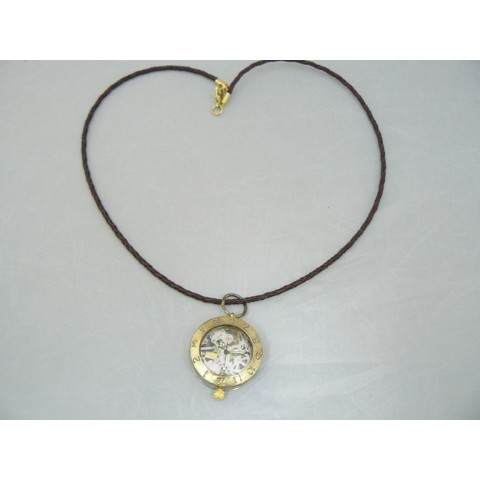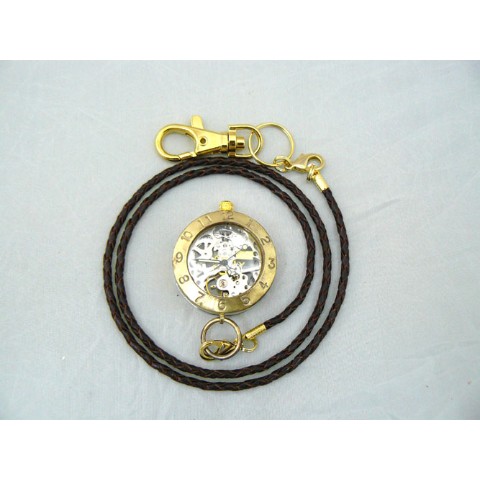 機械式手巻きモデル。個性的な懐中時計タイプです。機械の動きが楽しめる裏表スケルトン仕様です。ドーナツ状のベゼルに時間を刻印し、視認性をアップさせています。本革製の4つ編みロープはいろいろな組合わせが可能ですので、ペンダントやキーホルダータイプにもできます。真鍮の素材感と機械式ムーブメントのレトロ感が絶妙にマッチしています。ケース直径約36mmのやや大きめのボディで存在感あるモデルです。機械式ムーブメント、レトロなケースデザイン、アンティーク感ある真鍮の素材感がマッチしたモデルです。ご注文から制作しますので、お届けまでに約3週間から1か月程お時間を頂きます。