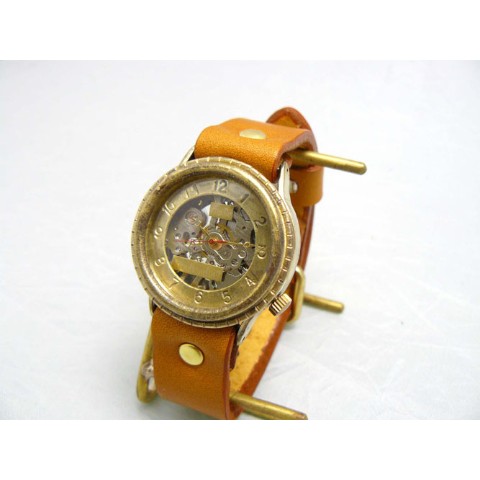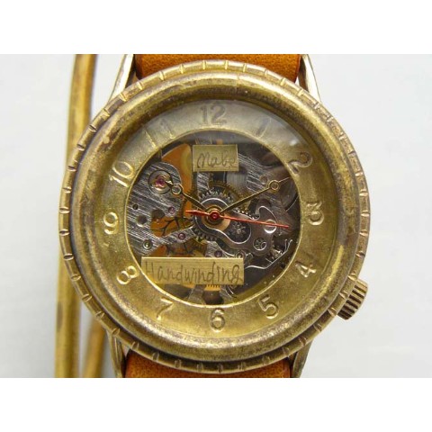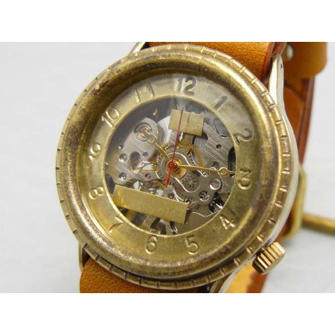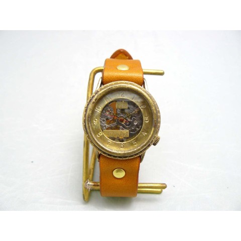 機械式手巻きモデル。機械の動きが楽しめる裏表スケルトン仕様です。時間表示をドーナツ盤に刻印し、視認性をアップさせています。ケース直径約32mmですので、男女問わずつけて頂けます。機械式ムーブメント、レトロなケースデザイン、アンティーク感ある真鍮の素材感がマッチしたモデルです。手巻きモデルですので、巻き上げないと止まってしまいます。いっぱいまで巻き上げて、1日?1日半動き続けます。ご注文から制作しますので、お届けまでに約3週間から1か月程お時間を頂きます。