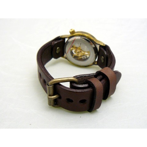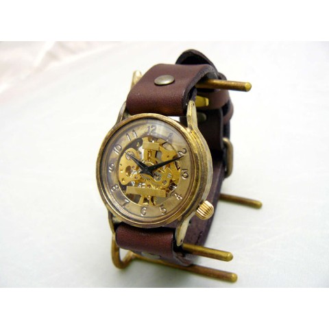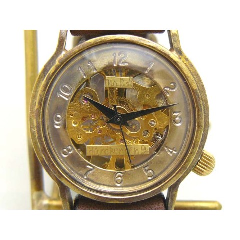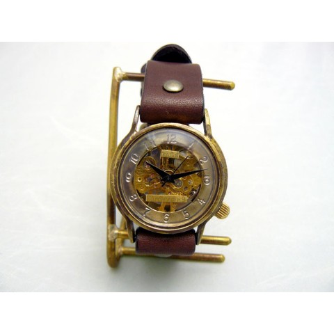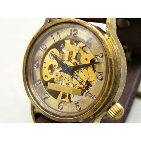 機械式手巻きモデル。機械の動きが楽しめる裏表スケルトン仕様です。時間表示をドーナツ盤に刻印し、視認性をアップさせています。ケース直径約32mmですので、男女問わずつけて頂けます。機械式ムーブメント、レトロなケースデザイン、アンティーク感ある真鍮の素材感がマッチしたモデルです。手巻きモデルですので、巻き上げないと止まってしまいます。いっぱいまで巻き上げて、1日?1日半動き続けます。ご注文から制作しますので、お届けまでに約3週間から1か月程お時間を頂きます。