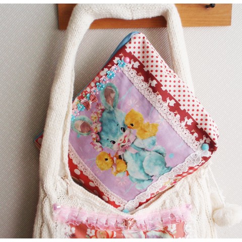 肌ざわりのいいホワイトニットと内側にポケットも付けて、生地を2重にしたので丈夫です!