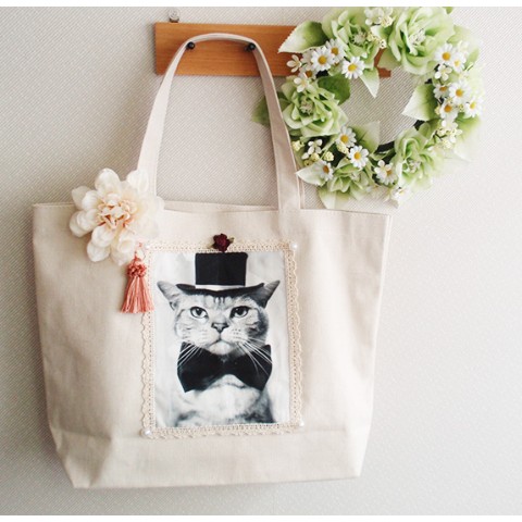 男爵猫☆スクエアバッグ★花タッセルブローチ付き☆A4OK!