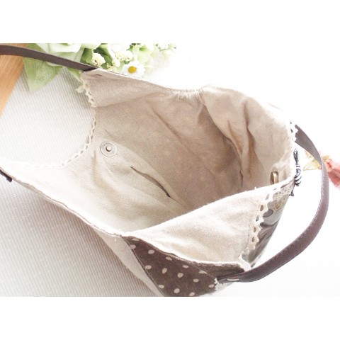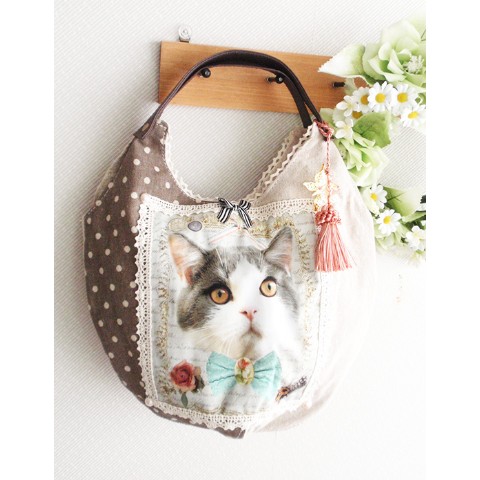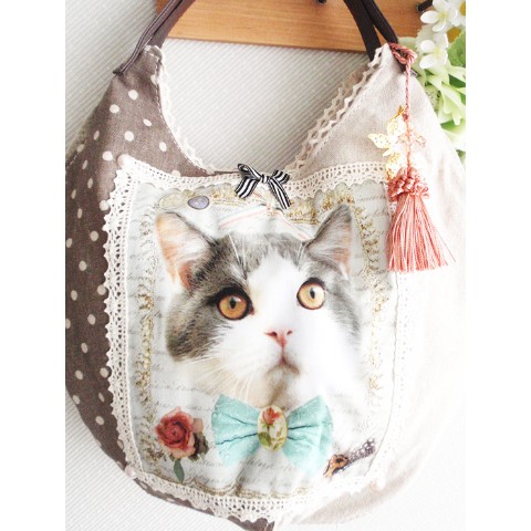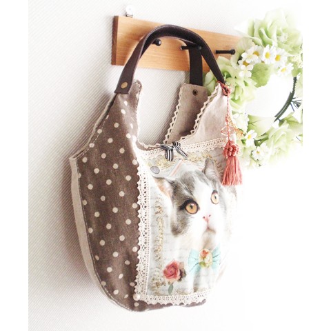 三毛猫丸型バッグ☆蝶タッセルチャーム付き!ナチュラル系に!