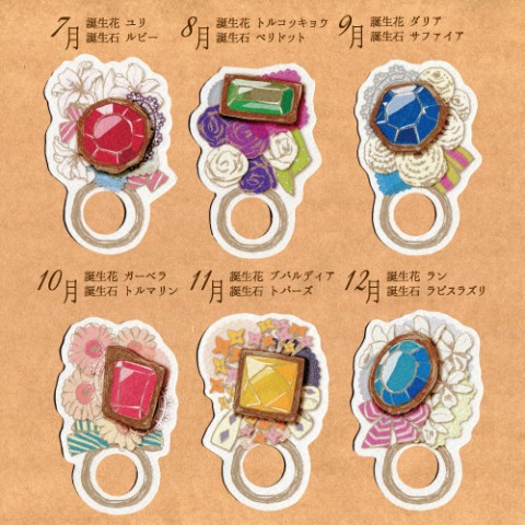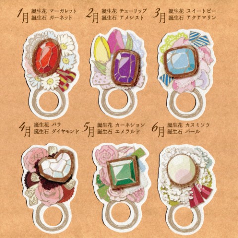 1月から12月までの誕生石と誕生花を組み合わせたイラストをリング型のメッセージカードにしました★バースデーカードやサンキューカード、プレゼントに添えてのメッセージカードにいかがでしょうか(^^) リング型になっておりますので指に通す事も出来ます!