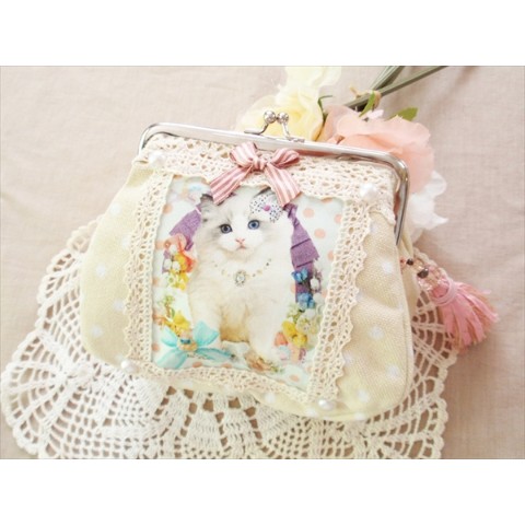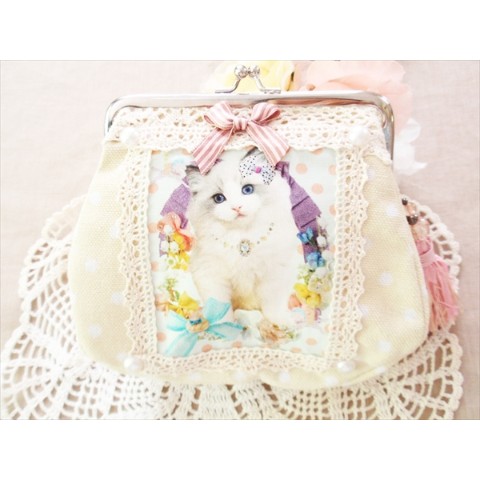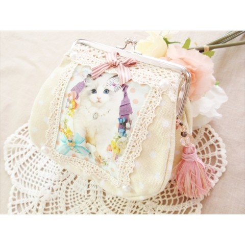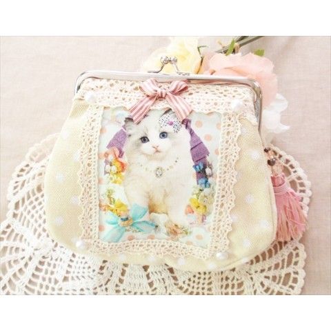 【SNOW BABY LOVE】リボンねこがま口ポーチ♪タッセルチャームも!水玉頒布生地