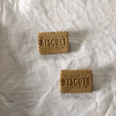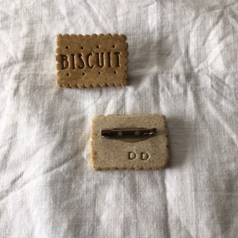 本物のビスケットと見間違えてしまいそうなくらい、美味しそうなブローチができました。一個ずつ粘土から切り出し製作しています。