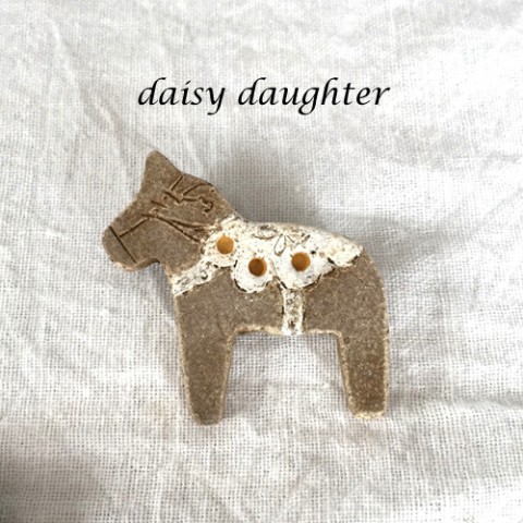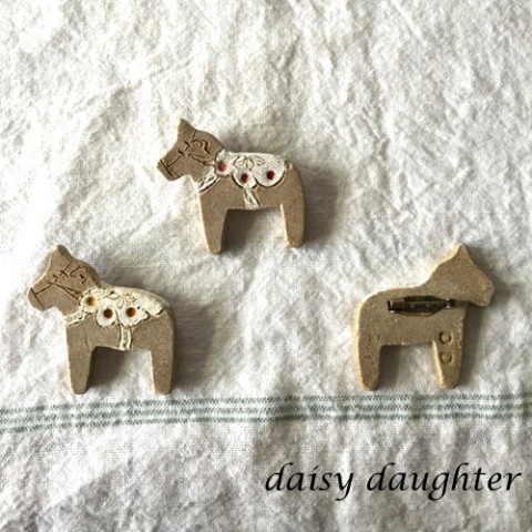 北欧のダーラナホースをイメージして作りました。一個ずつ型をぬき、絵を描いて製作しています。ハンドメイドのため、ひとつずつ風合いや形、素材の表情の出方が異なります。味わいとしてお楽しみください。また、陶器で出来ている為、お取り扱いは優しくお願い致します。