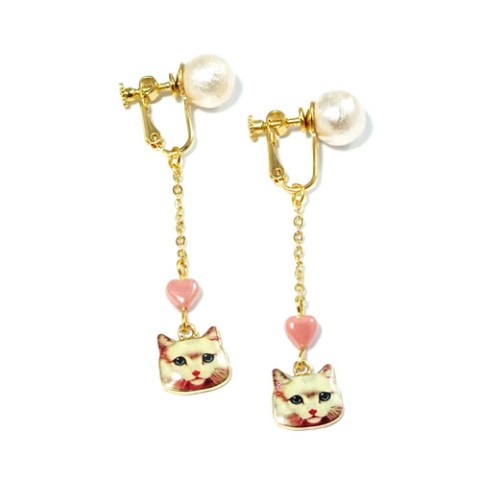 シンプルなコットンパール一粒イヤリングに、チェーンとピンクのハートとにゃんこのチャームを付けました☆