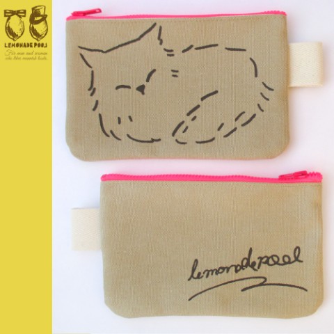 ぬこ好きな彼へ……ライトカーキの生地にダークブラウンで印刷、ファスナーは蛍光ピンク